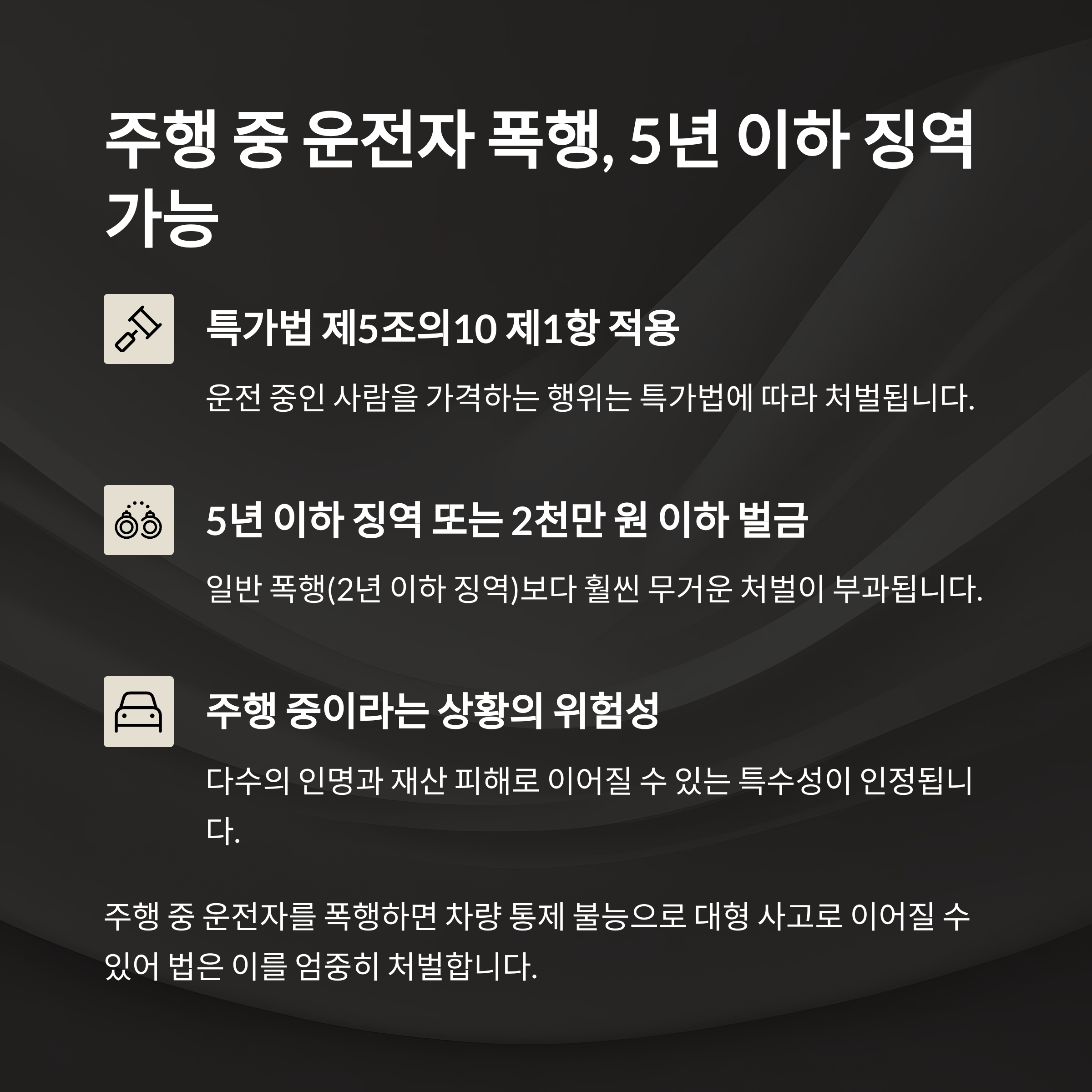 | 주행 중 운전자 폭행 | 특가법 제5조의10 | 5년 이하 징역 또는 2천만 원 이하 벌금 |