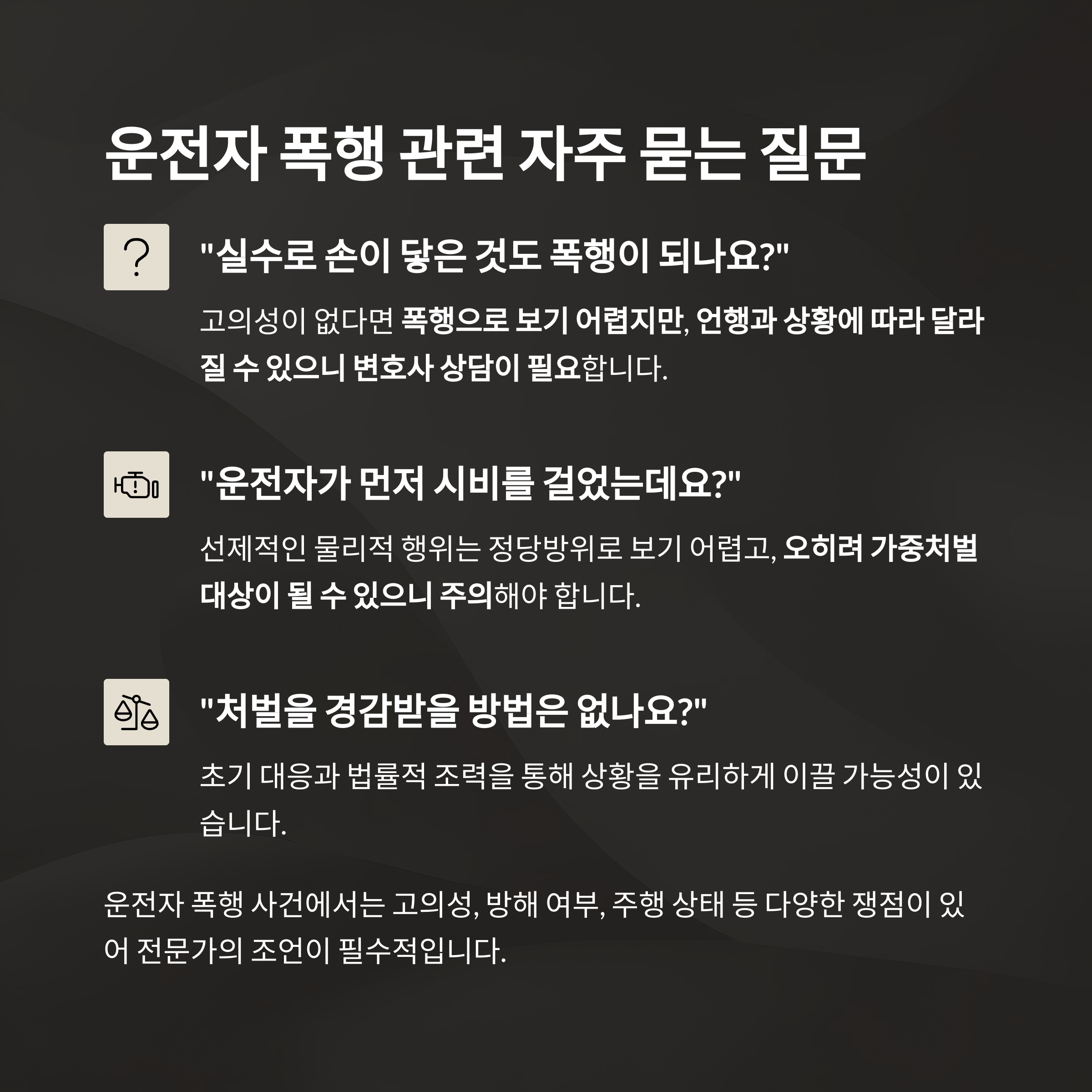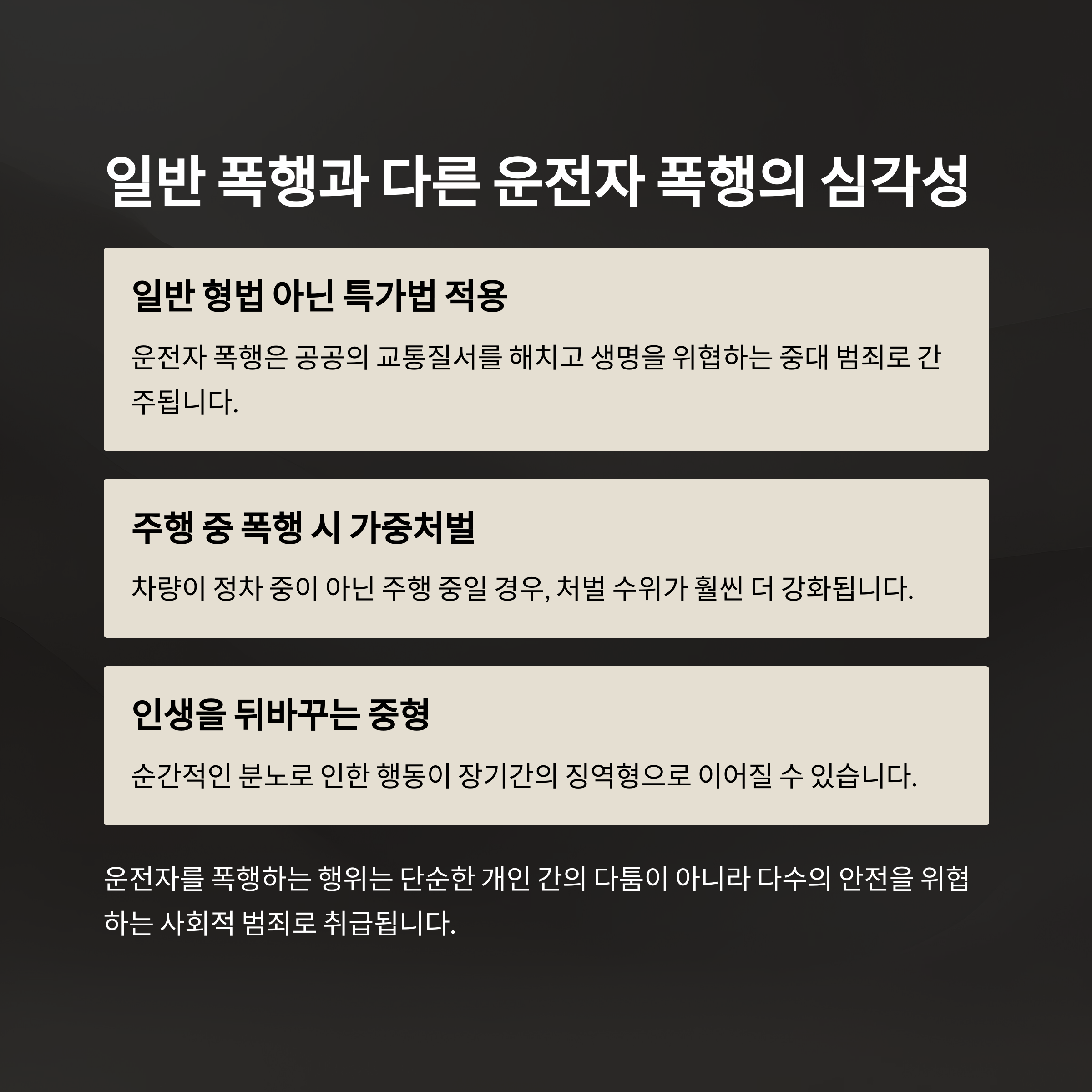 운전자폭행은 일반적인 폭행 사건과는 차원이 다른 법적 쟁점을 가집니다.