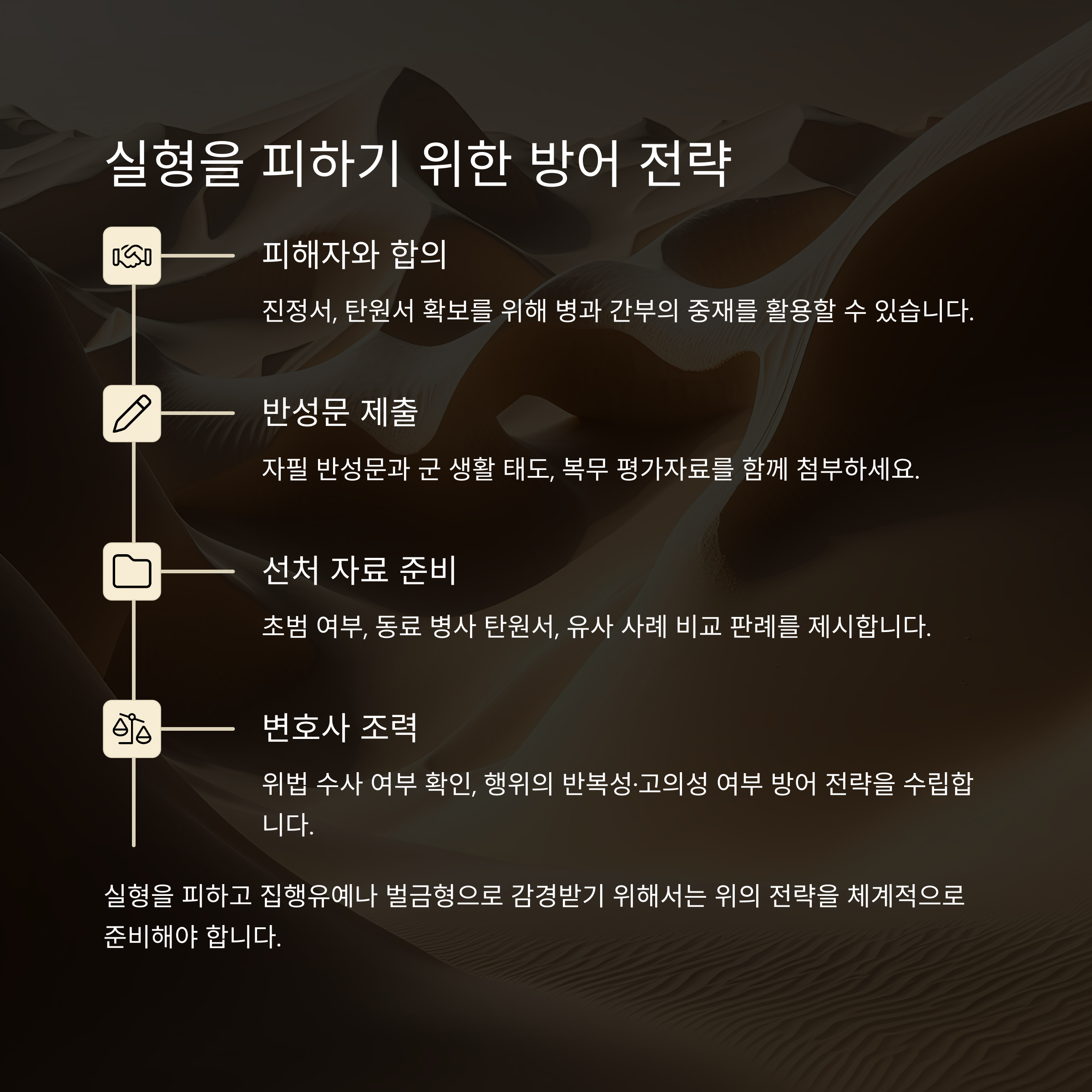 | 선처 자료 준비 | 초범 여부, 동료 병사 탄원서, 유사 사례 비교 판례 제시 |
