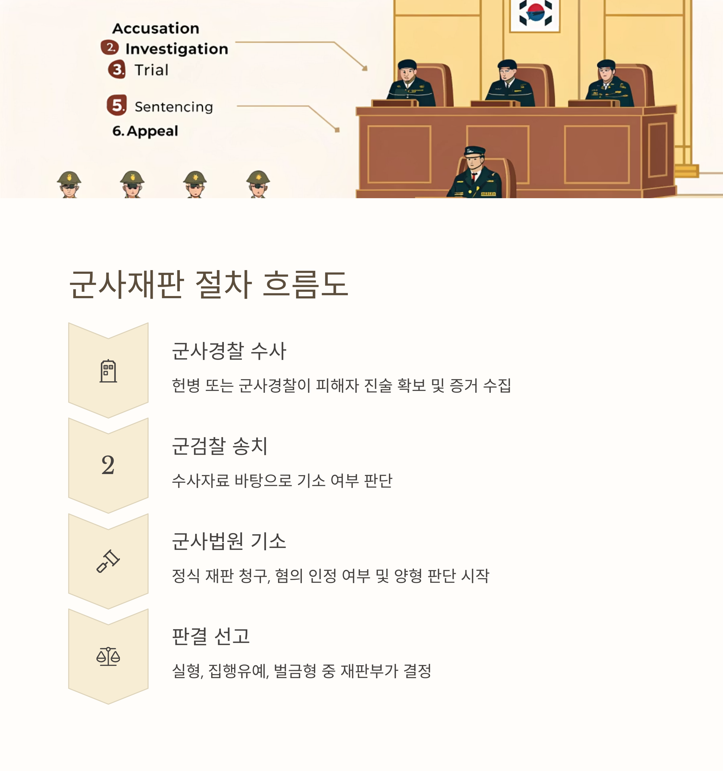 | ③ 군사법원 기소 | 정식 재판 청구, 혐의 인정 여부 및 양형 판단 시작 |