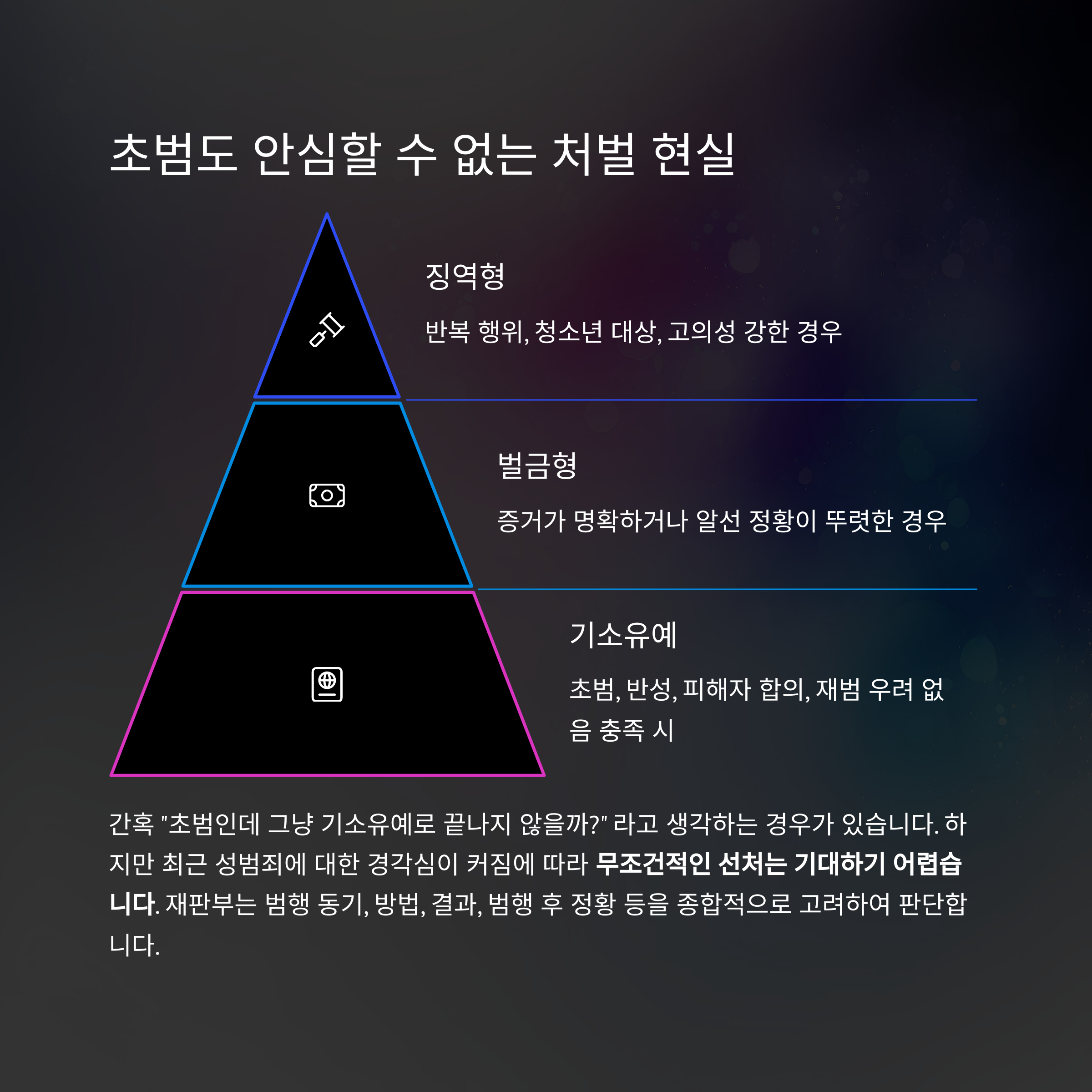 - 기소유예: 초범, 반성, 피해자 합의, 재범 우려 없음 등의 사유가 충족될 경우 가능