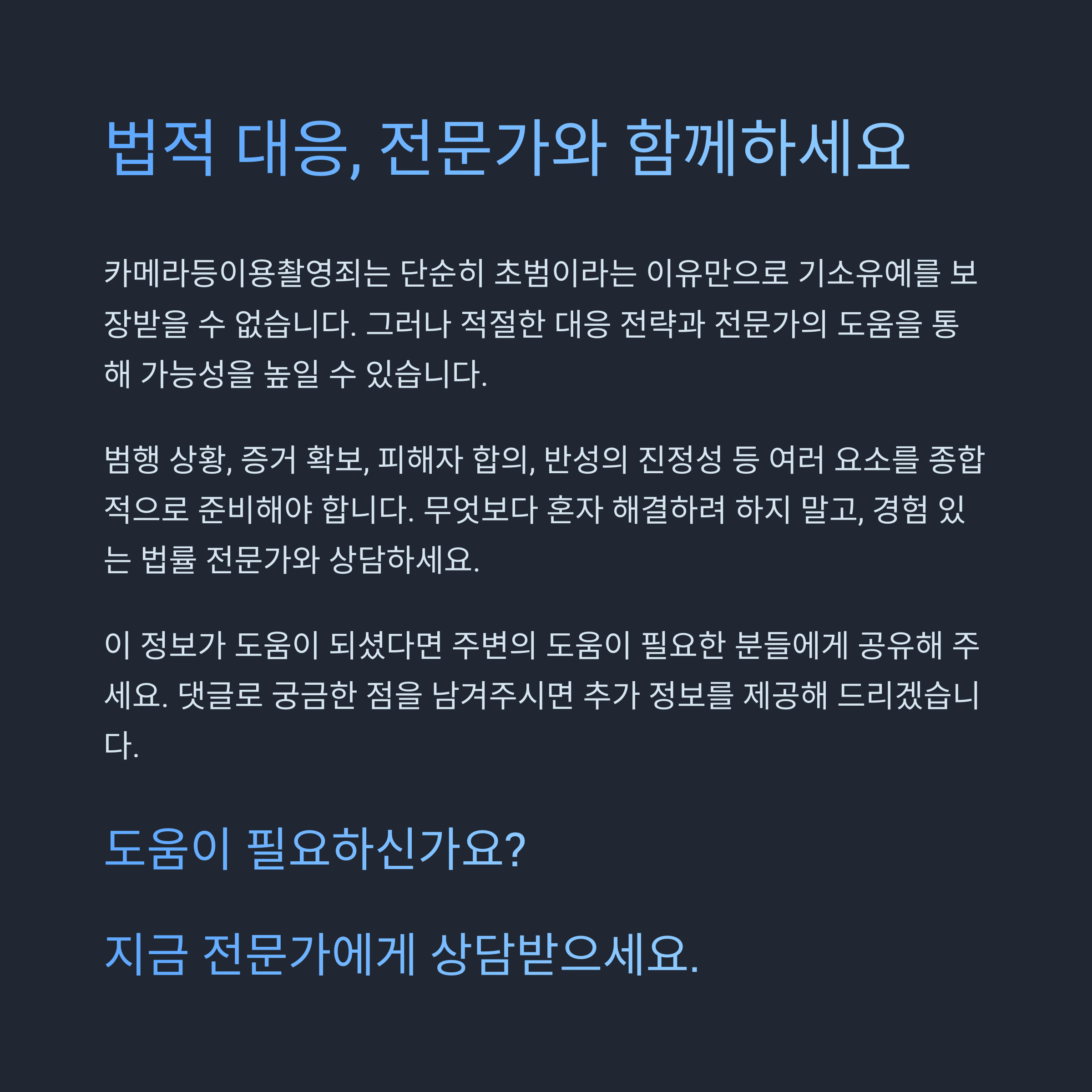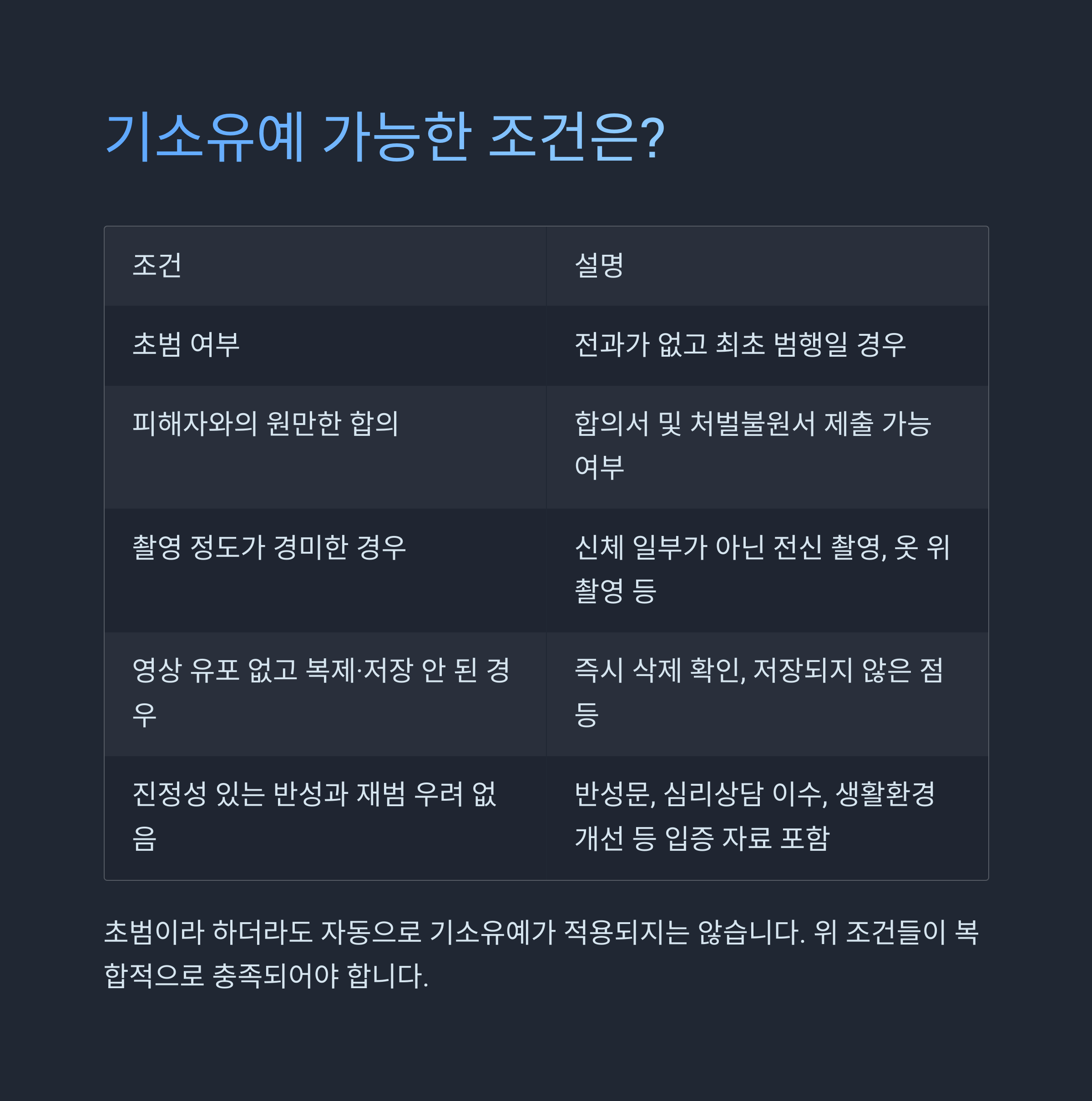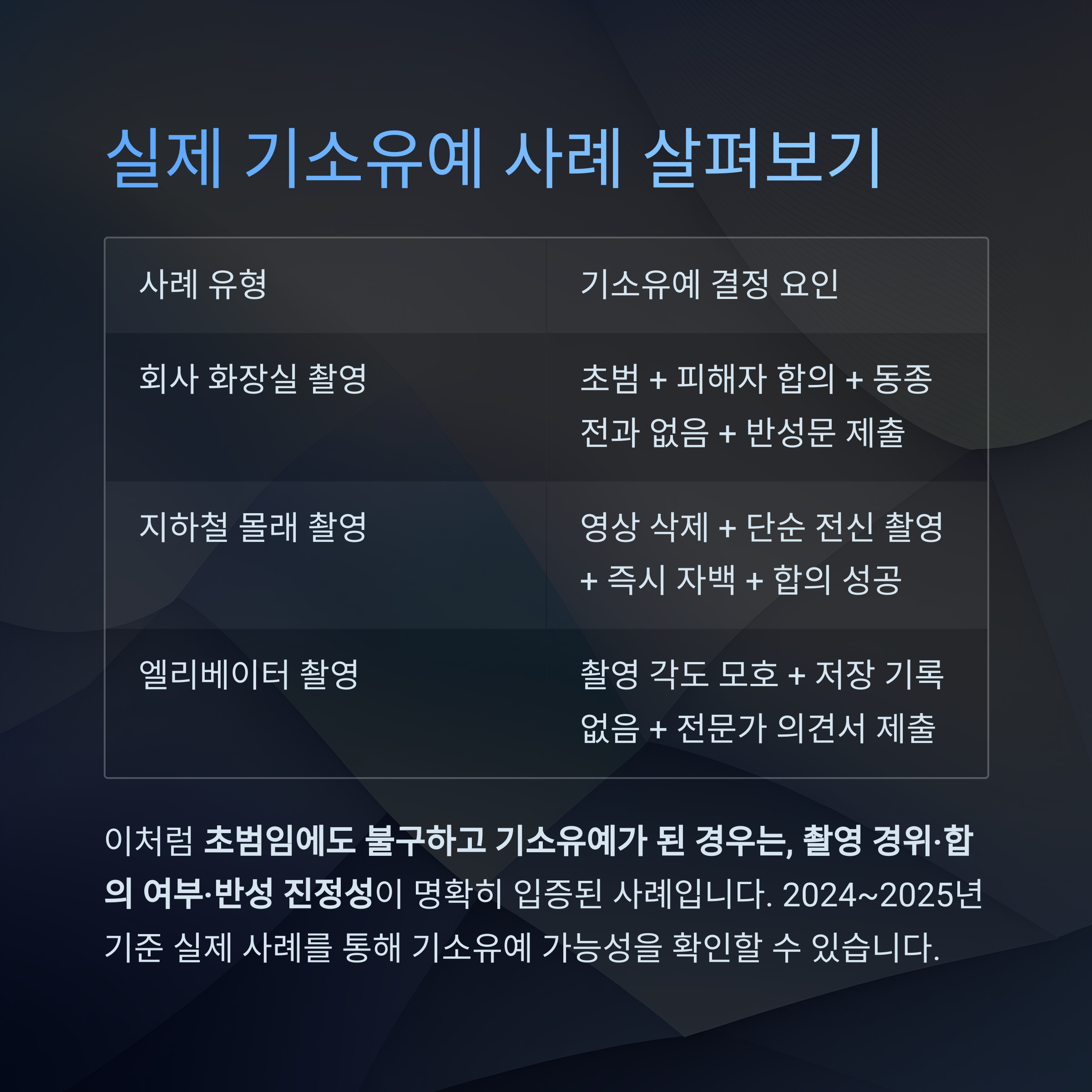 이처럼 초범임에도 불구하고 기소유예가 된 경우는, 촬영 경위·합의 여부·반성 진정성이 명확히 입증된 사례입니다.
