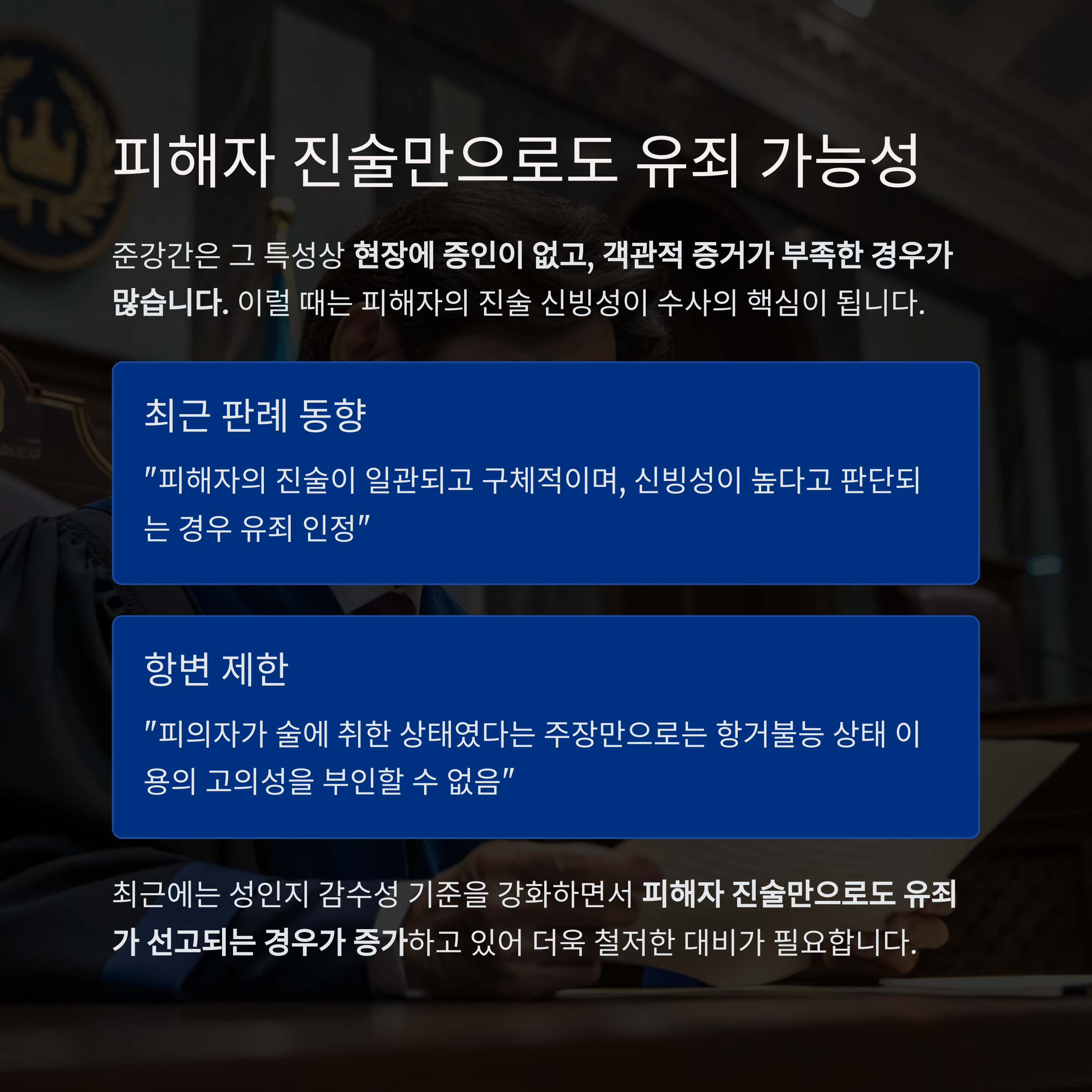 준강간은 그 특성상 현장에 증인이 없고, 객관적 증거가 부족한 경우가 많습니다.