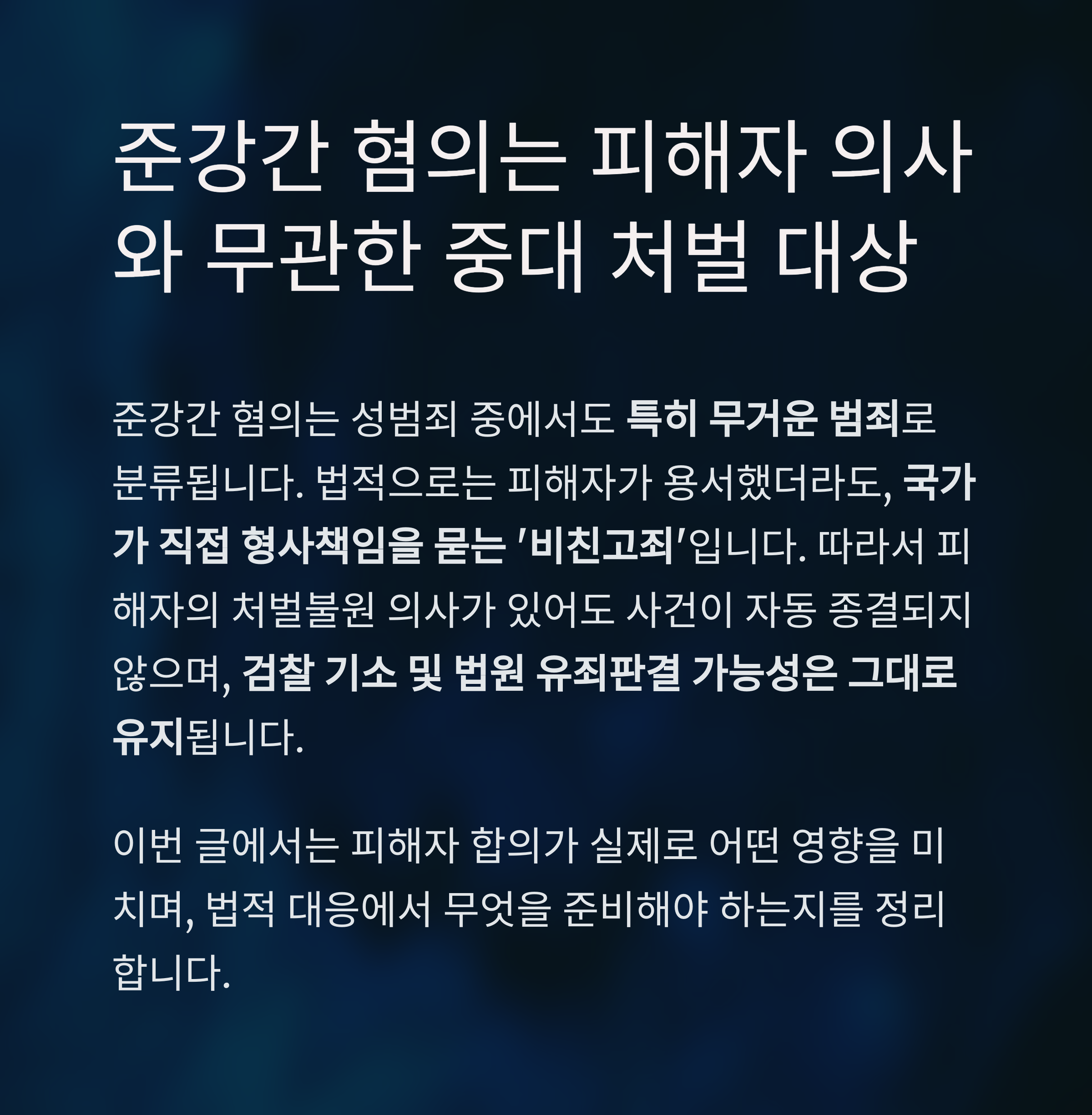 준강간 혐의는 피해자 의사와 무관하게 중대 처벌 대상입니다
