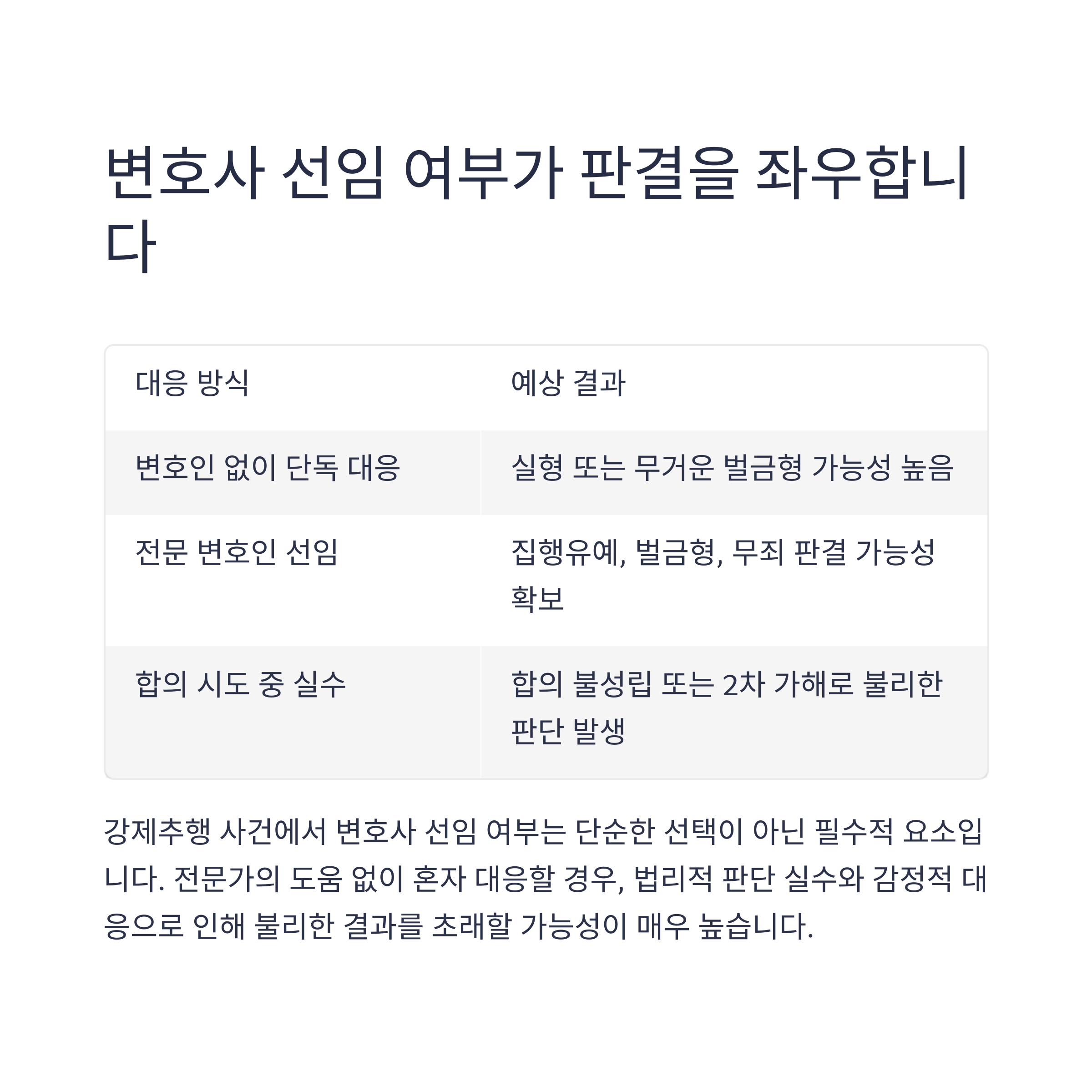 | 변호인 없이 단독 대응 | 실형 또는 무거운 벌금형 가능성 높음 |