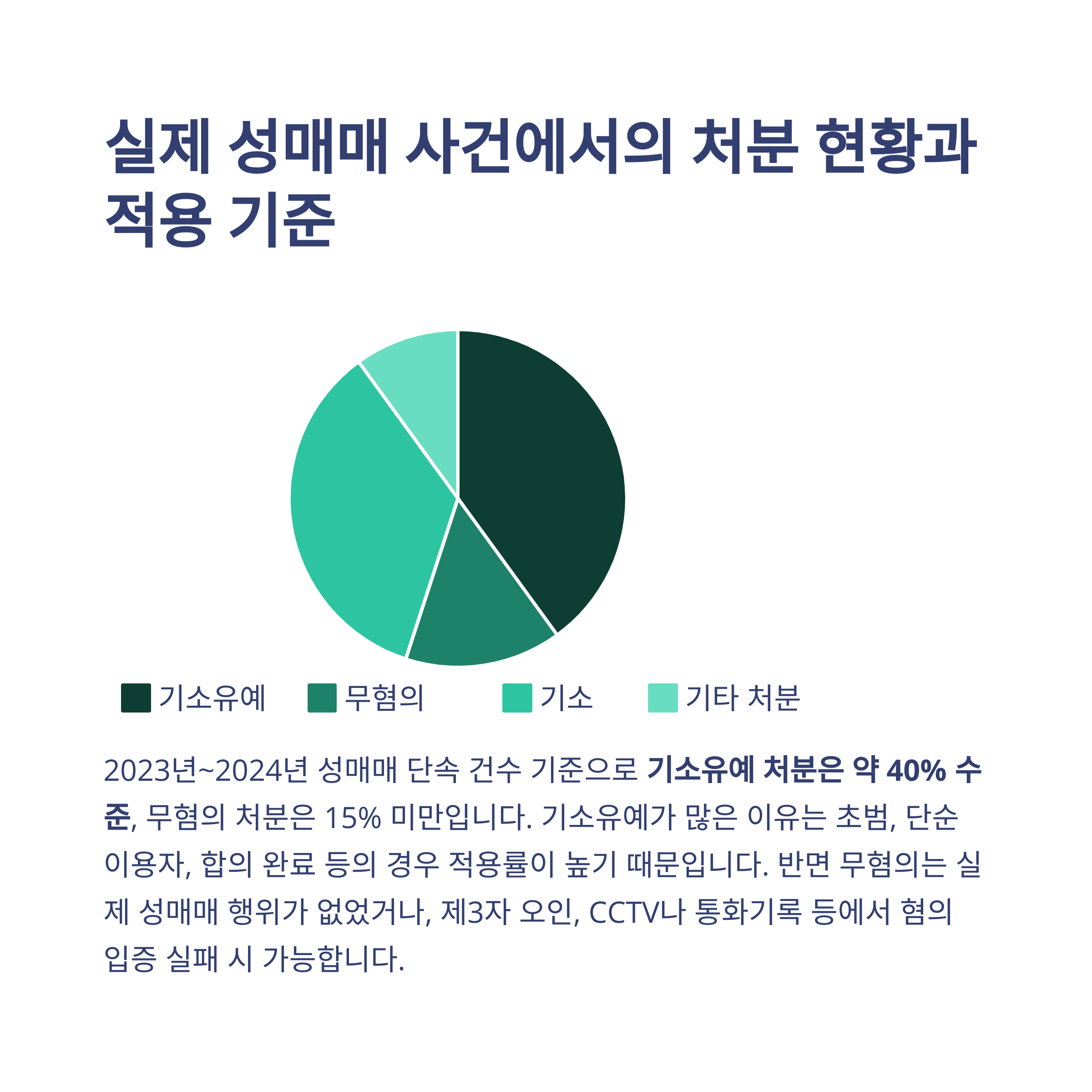 성매매 사건에서 경찰 조사나 검찰 송치 후 ‘기소유예’나 ‘무혐의’ 처분을 받는 경우가 많습니다.