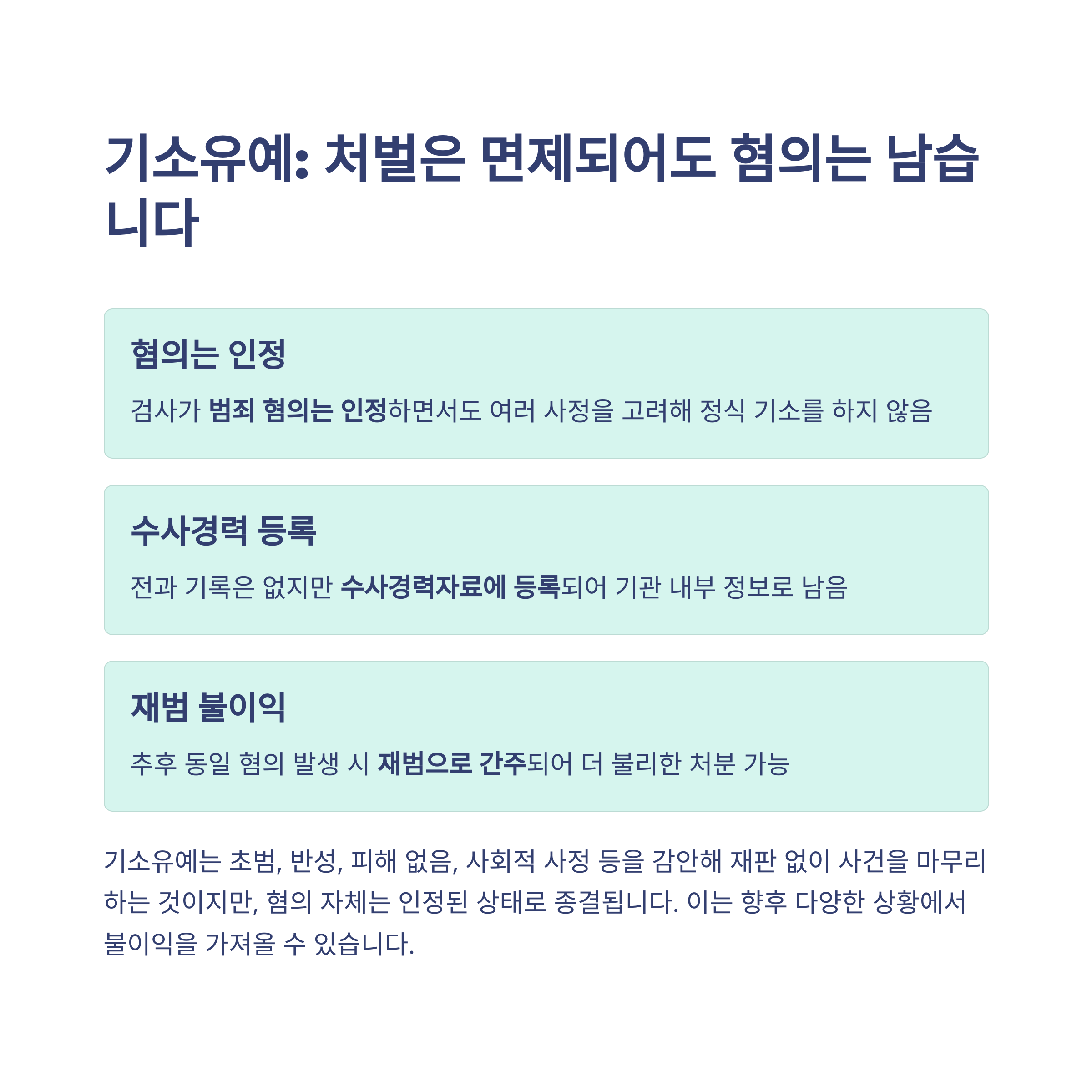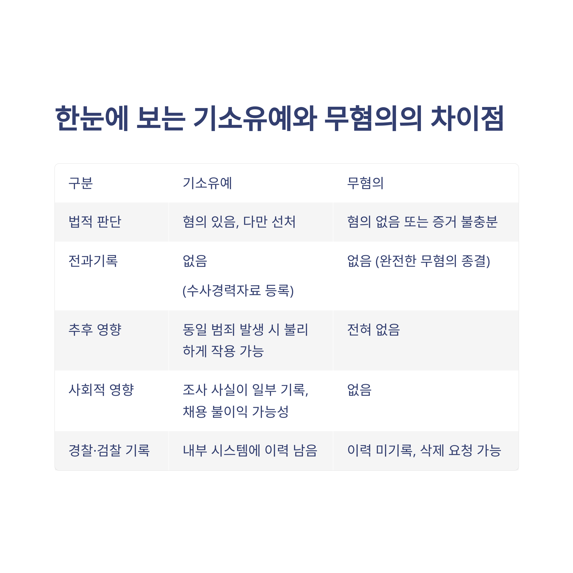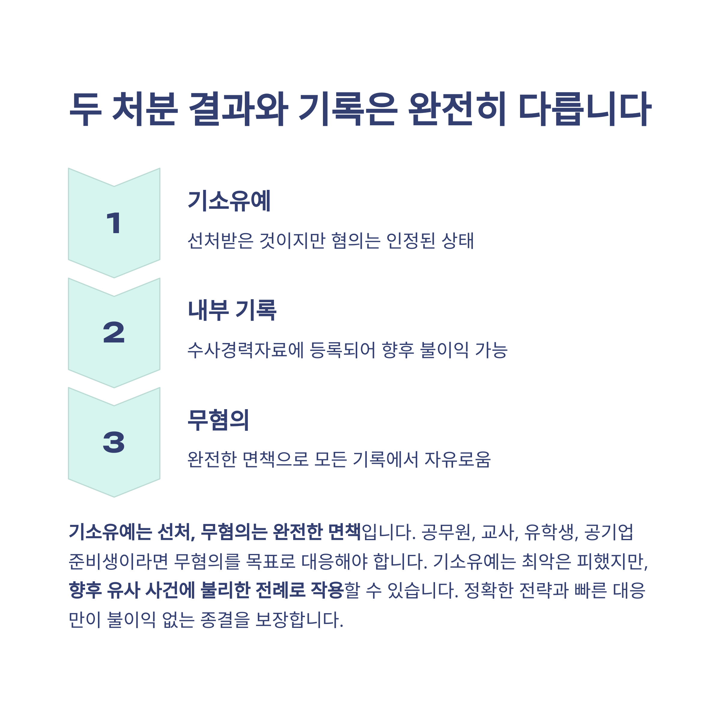 두 처분 모두 ‘재판을 받지 않는다’는 공통점이 있지만, 결과는 전혀 다릅니다. 공직자, 취업 준비생, 유학생이라면 특히 주의가 필요합니다.