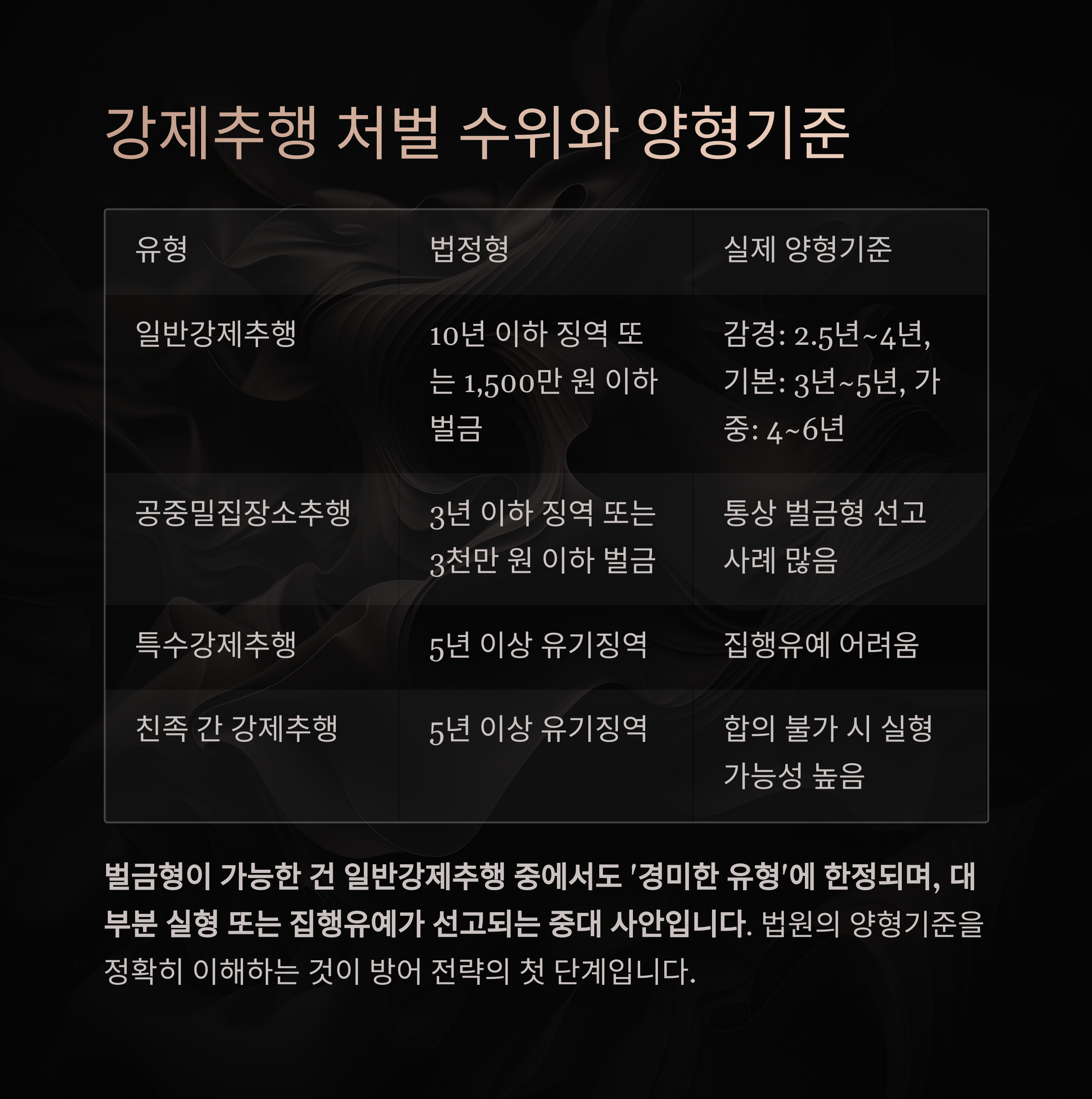 | 일반강제추행 | 10년 이하 징역 또는 1,500만 원 이하 벌금 | 감경: 2.5년~4년, 기본: 3년~5년, 가중: 4년~6년 |