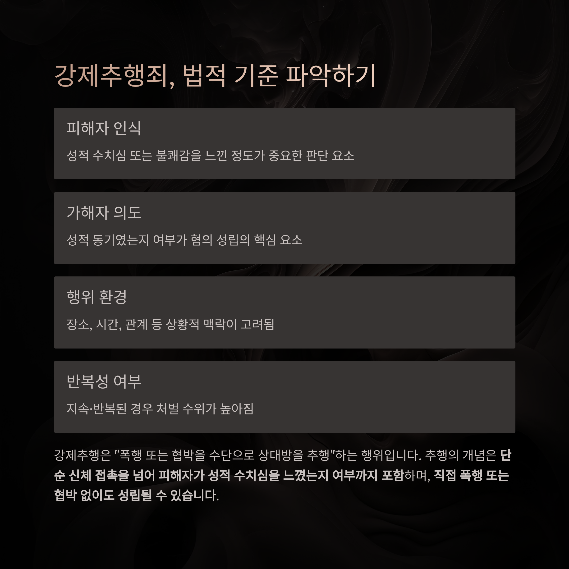 강제추행은 "폭행 또는 협박을 수단으로 상대방을 추행"하는 행위입니다