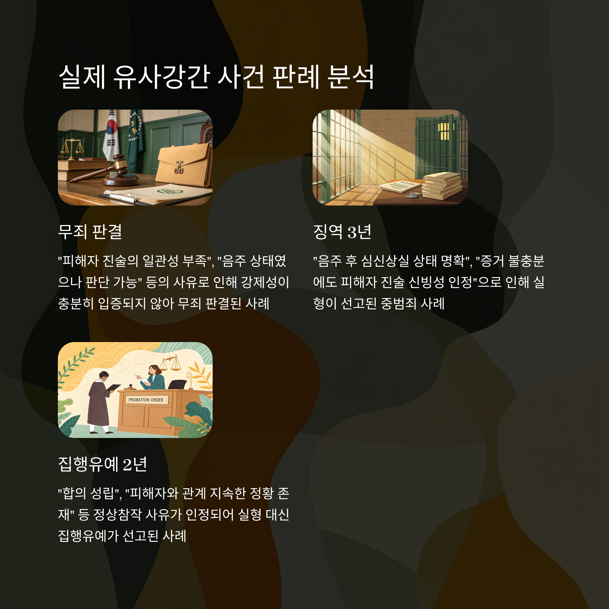 | 무죄 | "피해자 진술의 일관성 부족", "음주 상태였으나 판단 가능" |