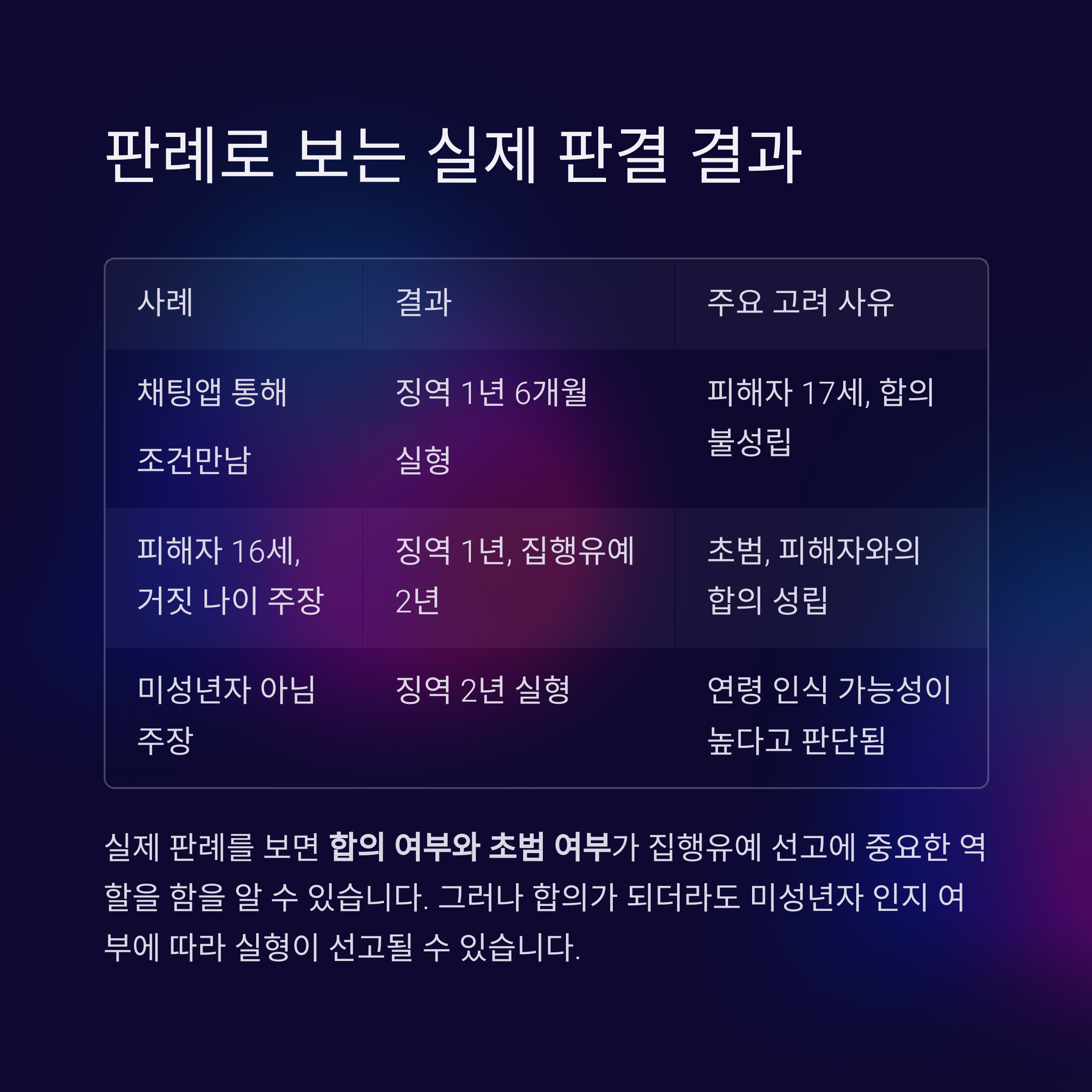 | 피해자 16세, 거짓 나이 주장 | 징역 1년, 집행유예 2년 | 초범, 피해자와의 합의 |