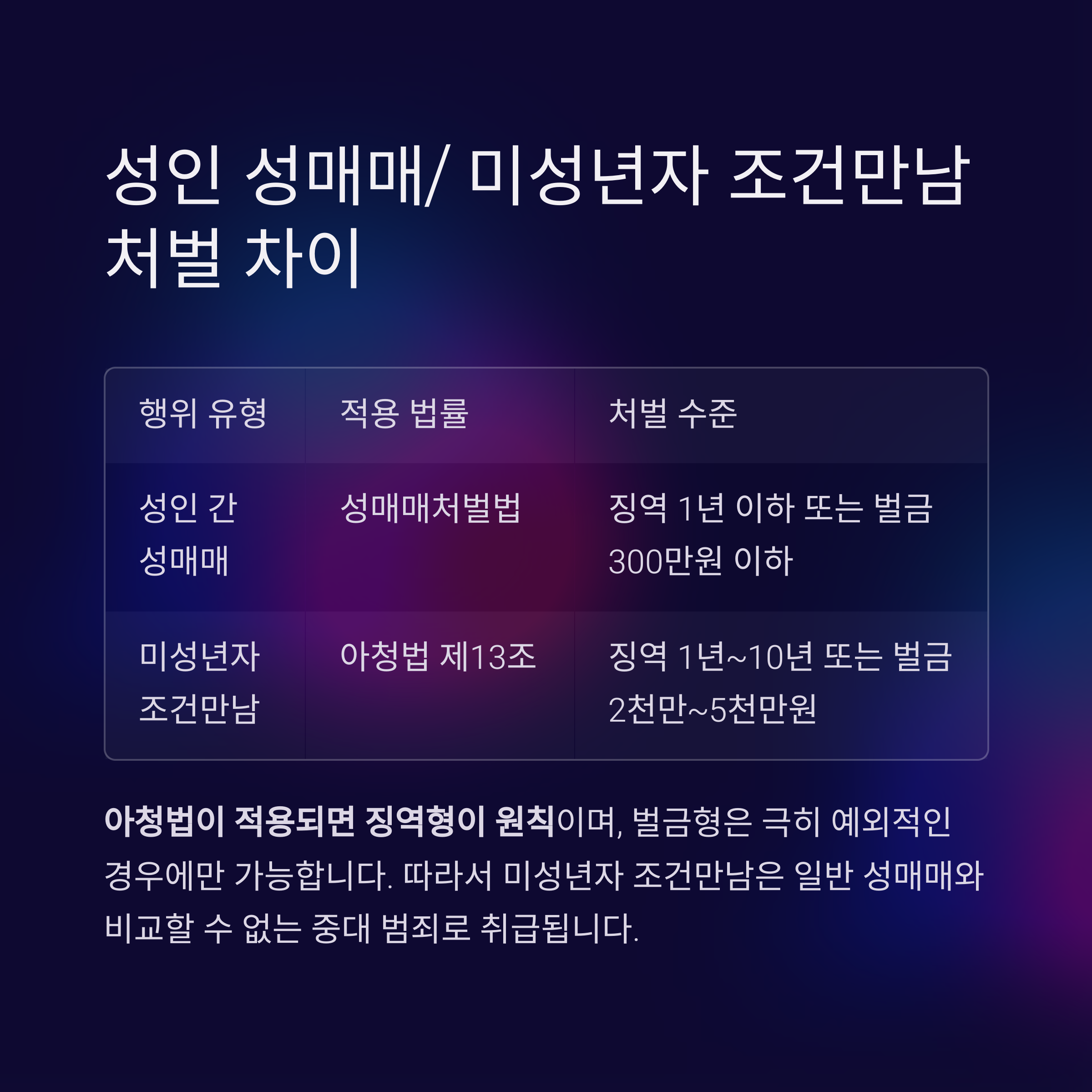 | 미성년자 조건만남 | 아청법 제13조 | 징역 1년~10년 또는 벌금 2천만~5천만원 |