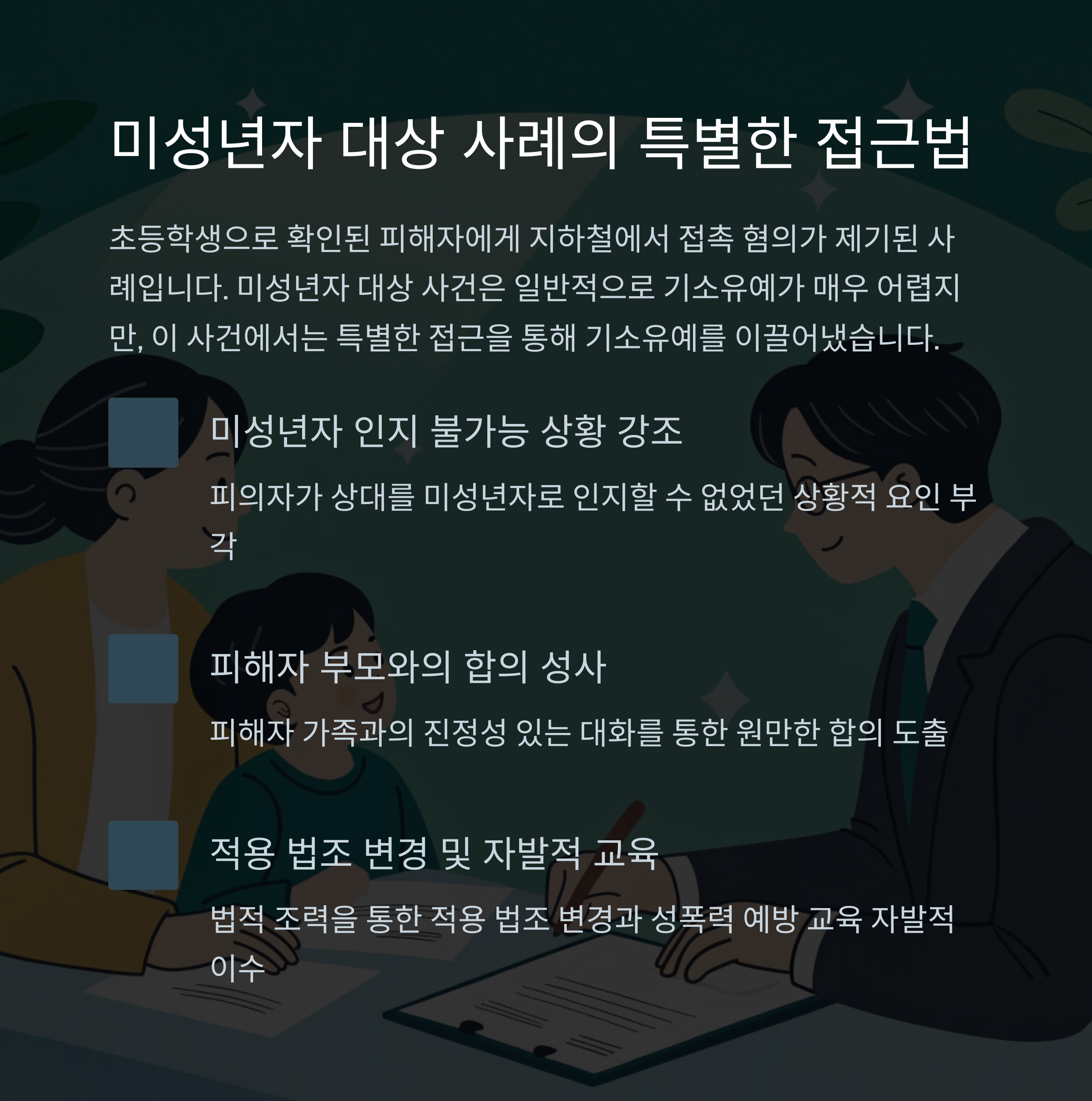 | 미성년자 대상 추행 | 상대 인식 어려움, 법조 변경, 피해자 가족과의 합의 |