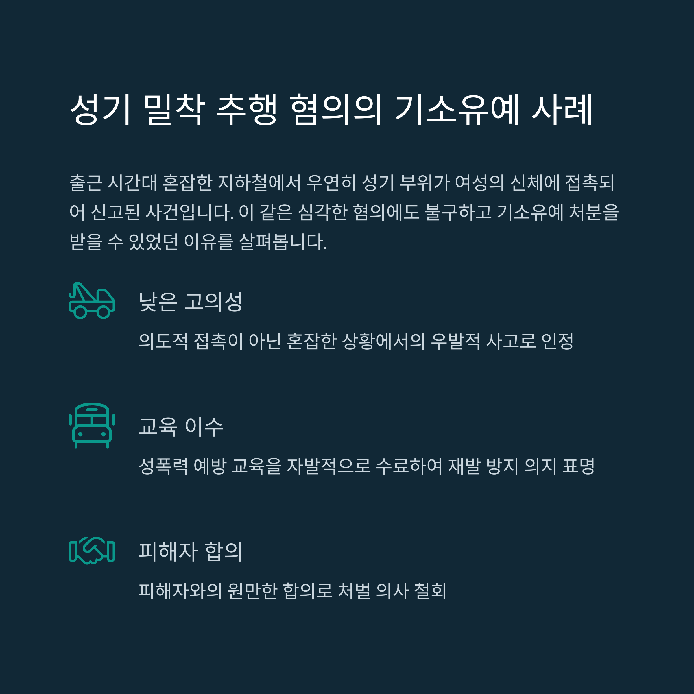 | 지하철 성기 접촉 혐의 | 교육 이수, 고의성 부재, 피해자 합의 |