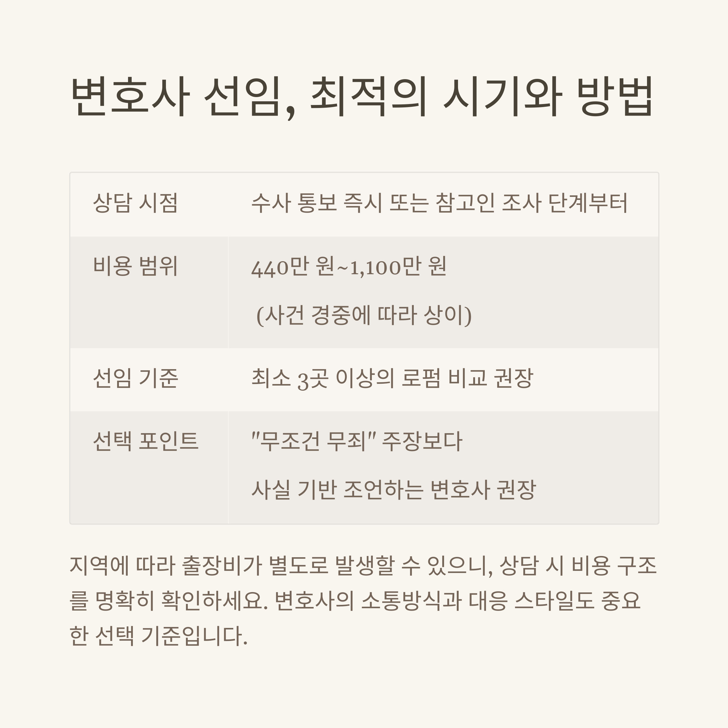 수사 통보를 받는 즉시, 또는 참고인 조사 단계부터 선임이 가능합니다.