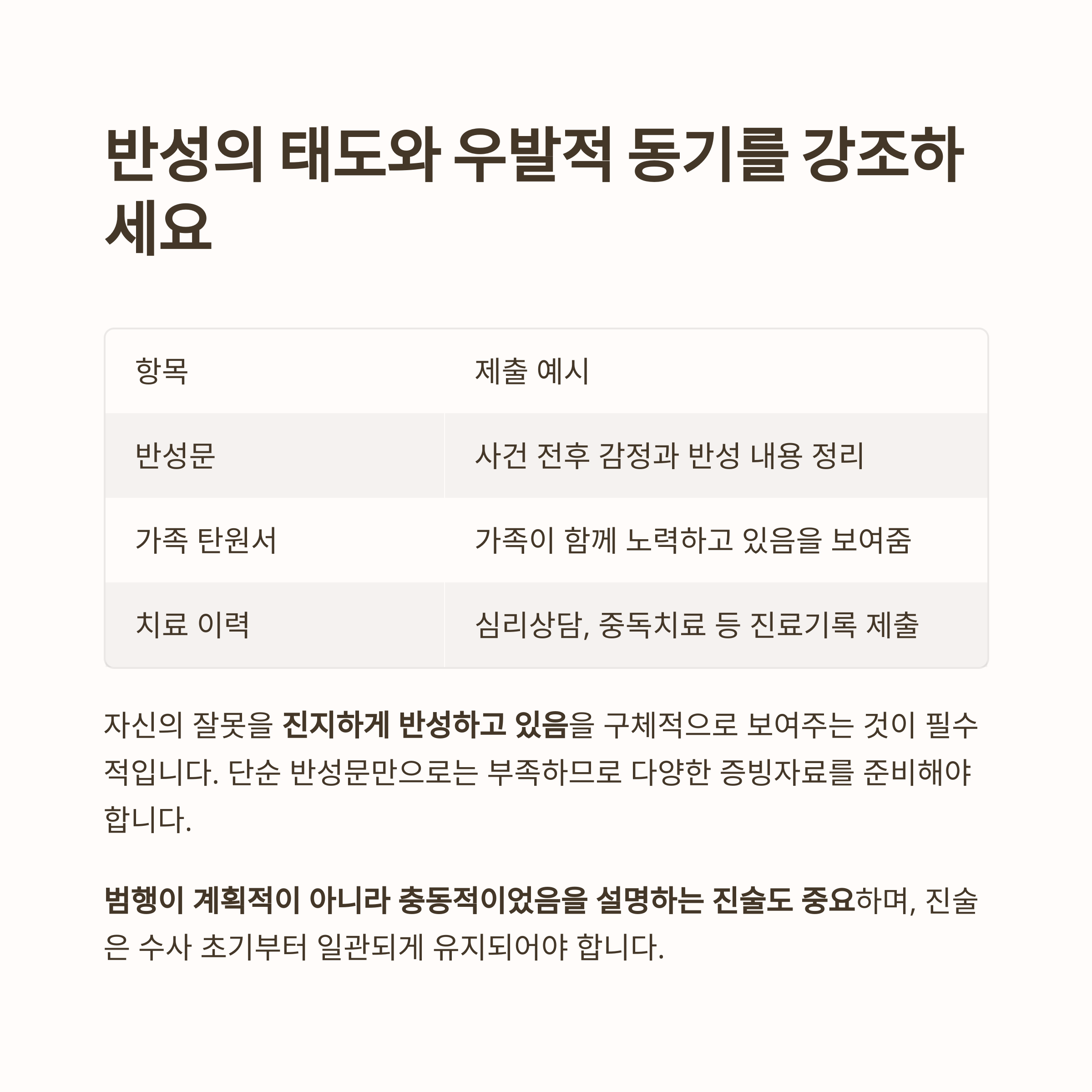 | 반성 태도 | 진정성과 자료 동반 제출 필요 |
