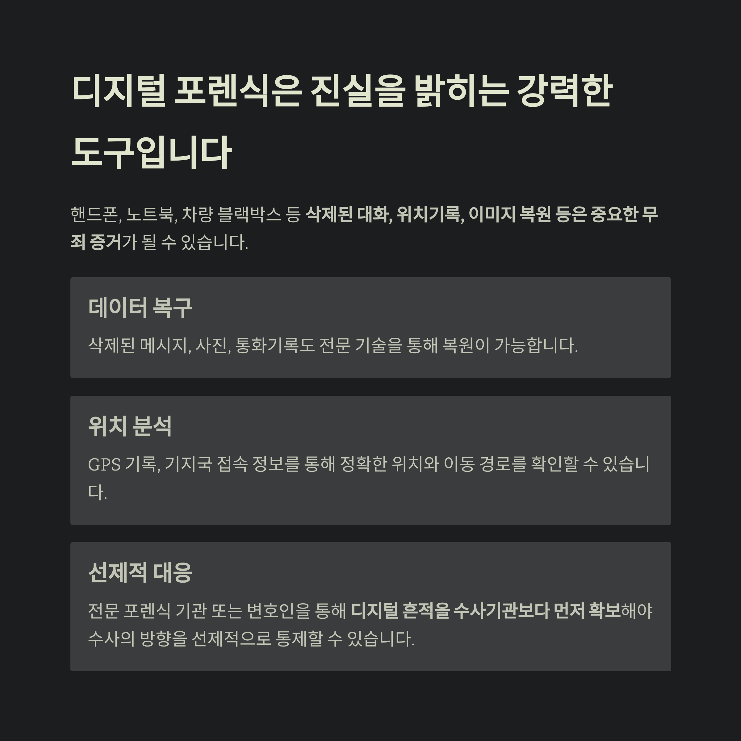 삭제된 대화, 위치기록, 이미지 복원 등은 중요한 무죄 증거가 될 수 있습니다