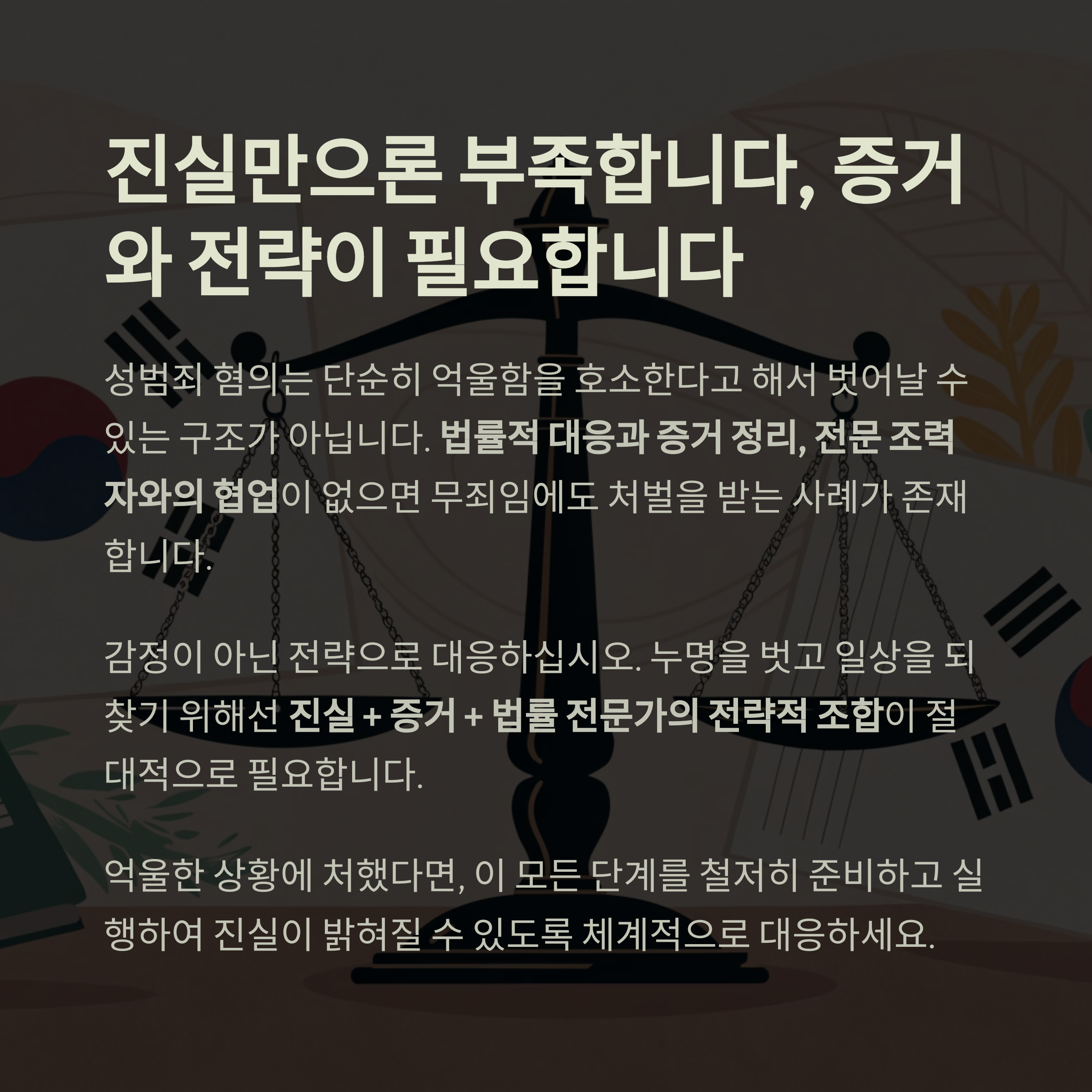 진실 + 증거 + 법률 전문가의 전략적 조합이 절대적으로 필요합니다