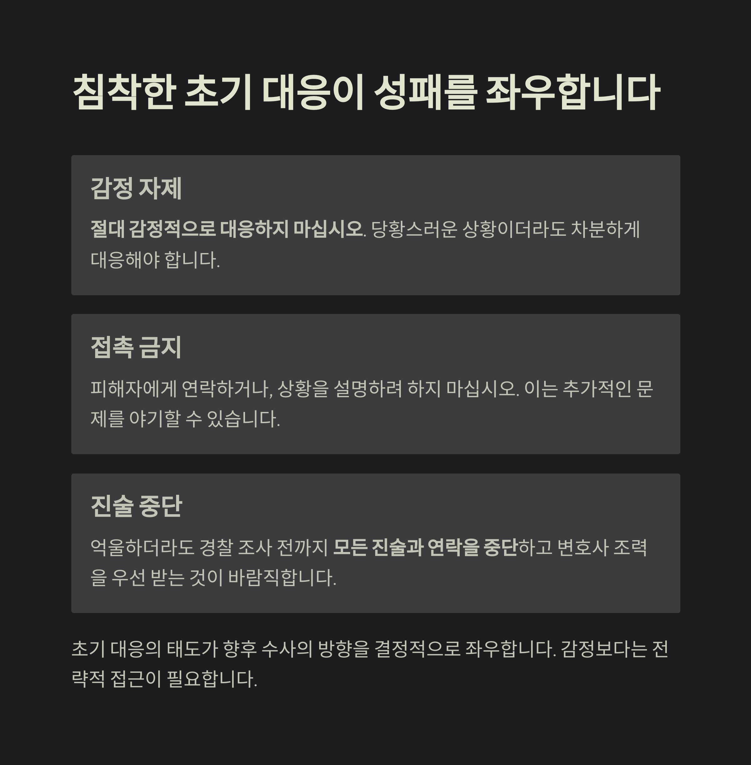 - 억울하더라도 경찰 조사 전까지 모든 진술과 연락을 중단하고