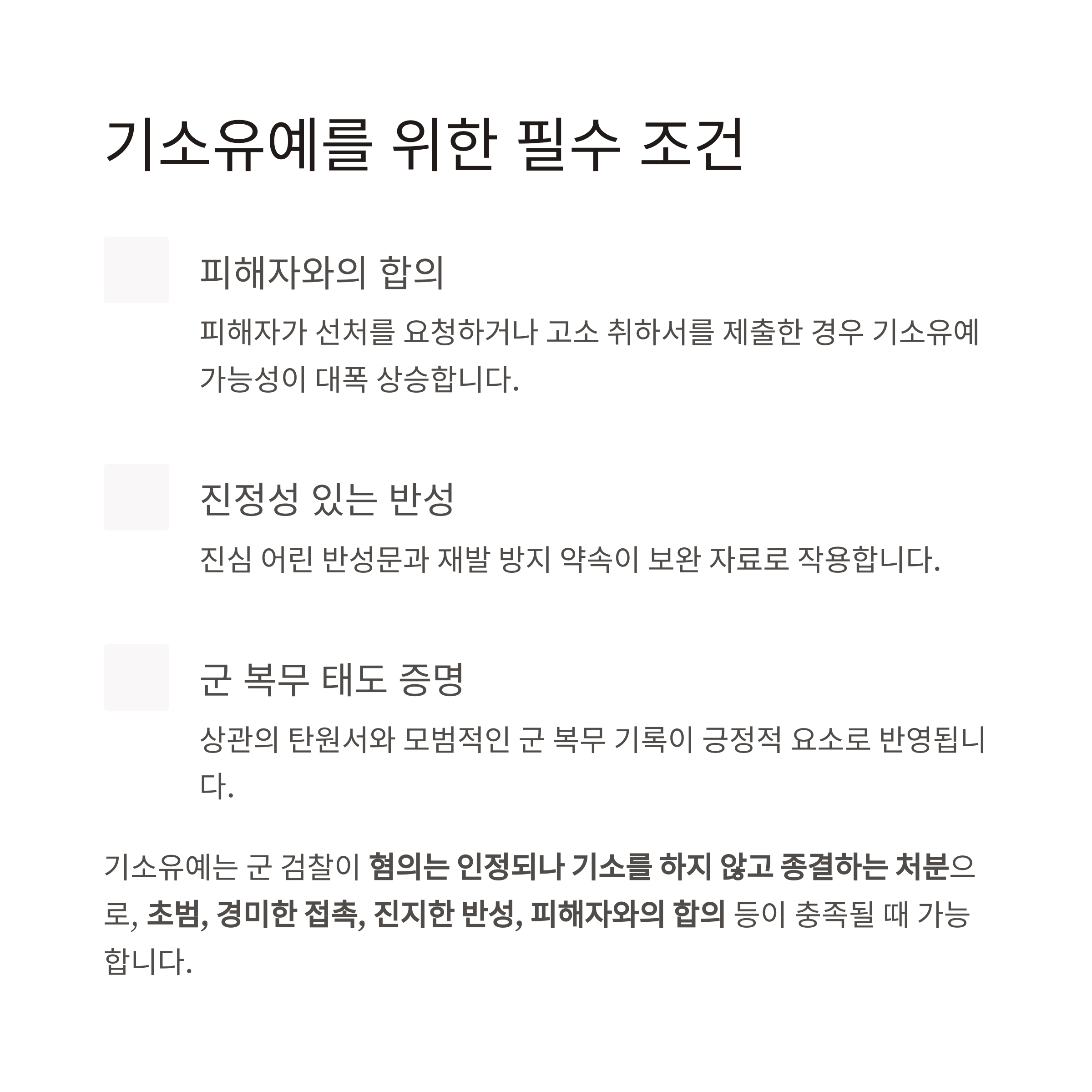 기소유예는 군 검찰이 혐의는 인정되나 기소를 하지 않고 종결하는 처분입니다