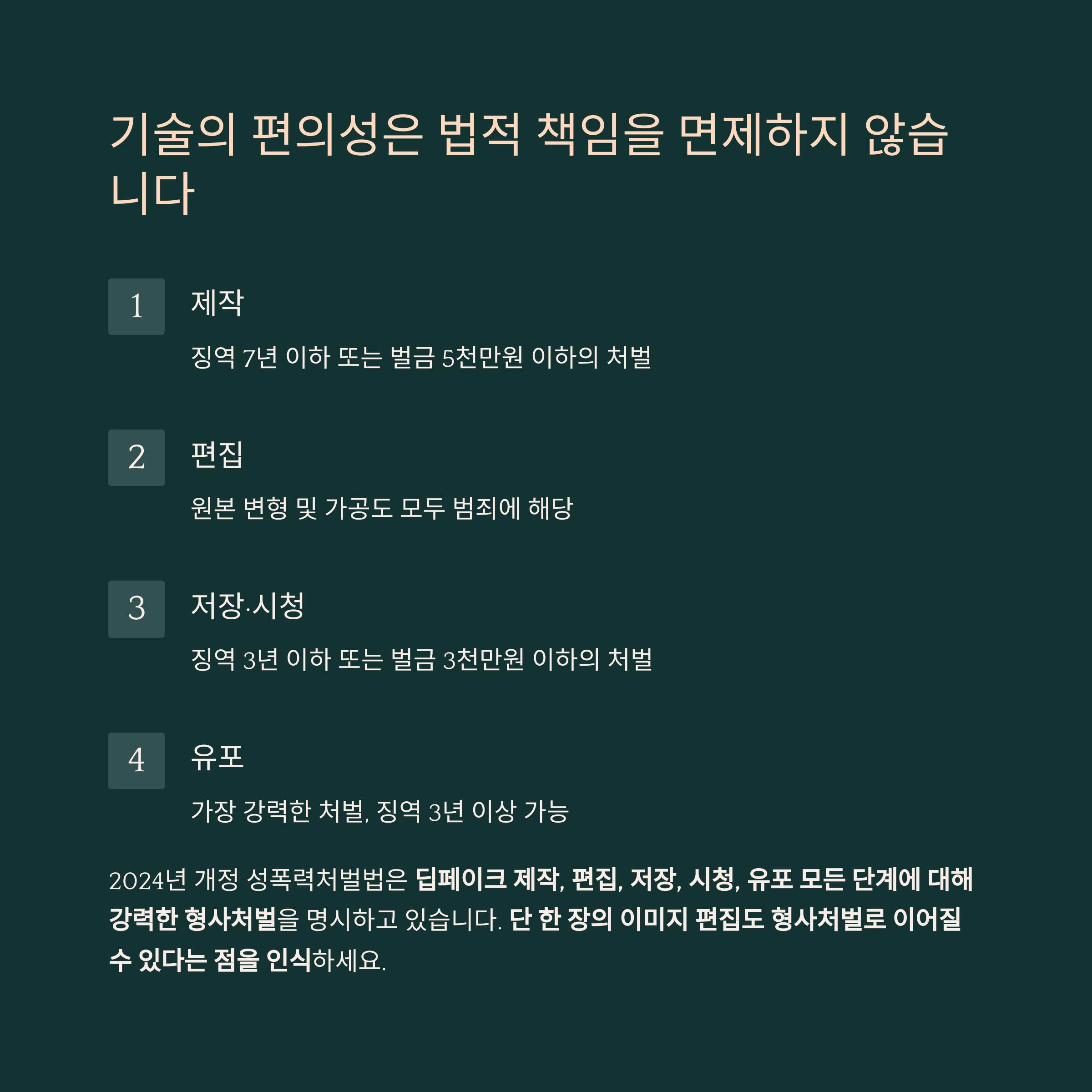 딥페이크 제작, 편집, 저장, 시청, 유포 모든 단계에 대해 강력한 형사처벌을 명시하고 있습니다