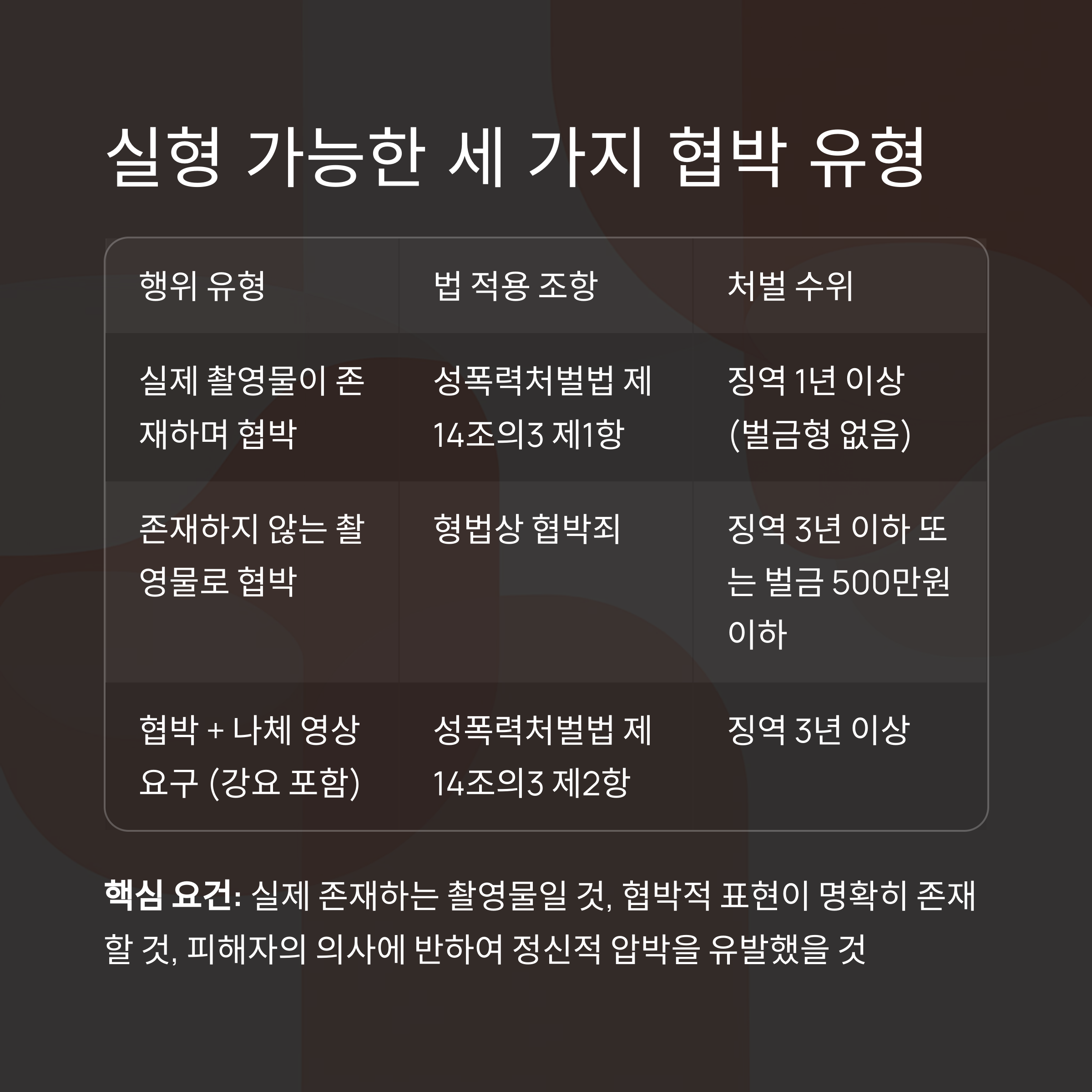 | 실제 촬영물이 존재하며 협박 | 성폭력처벌법 제14조의3 | 징역 1년 이상 (벌금형 없음) |