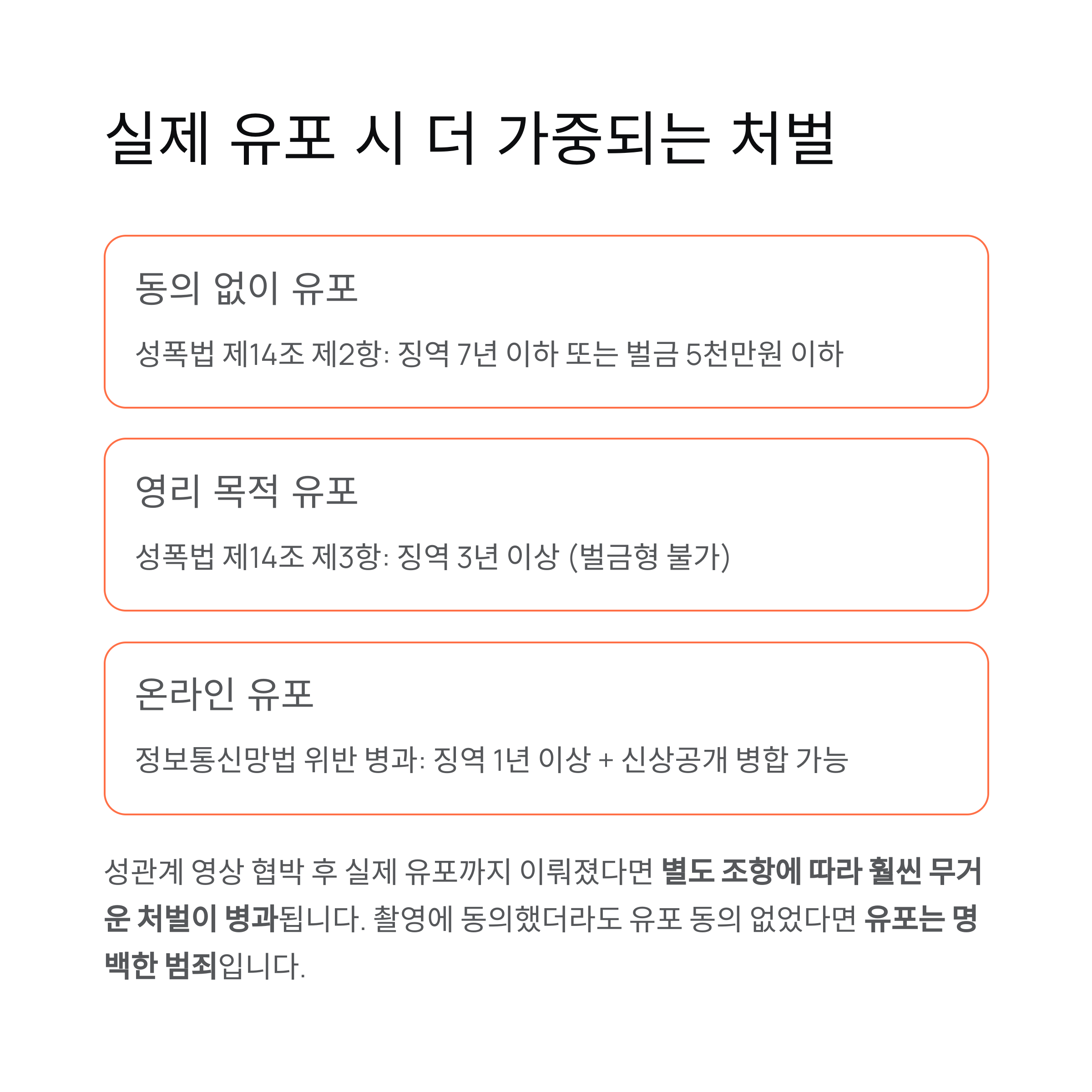 | 온라인 유포 및 링크 전달 | 정보통신망법 위반 병과 | 징역 1년 이상 + 신상공개 병합 가능 |