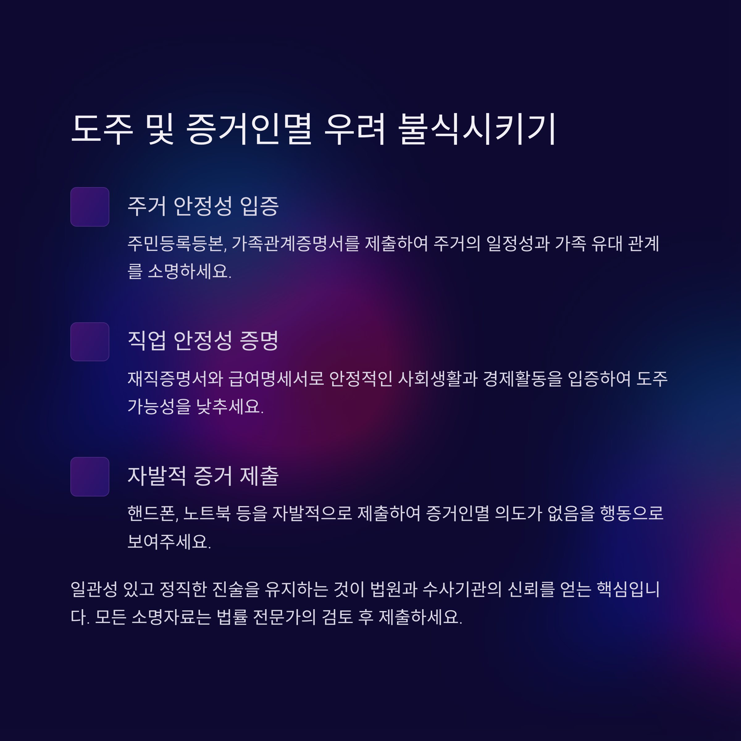 | 도주 및 증거인멸 우려 부재 소명 | 일정 주거, 자발적 제출, 성실 진술 |