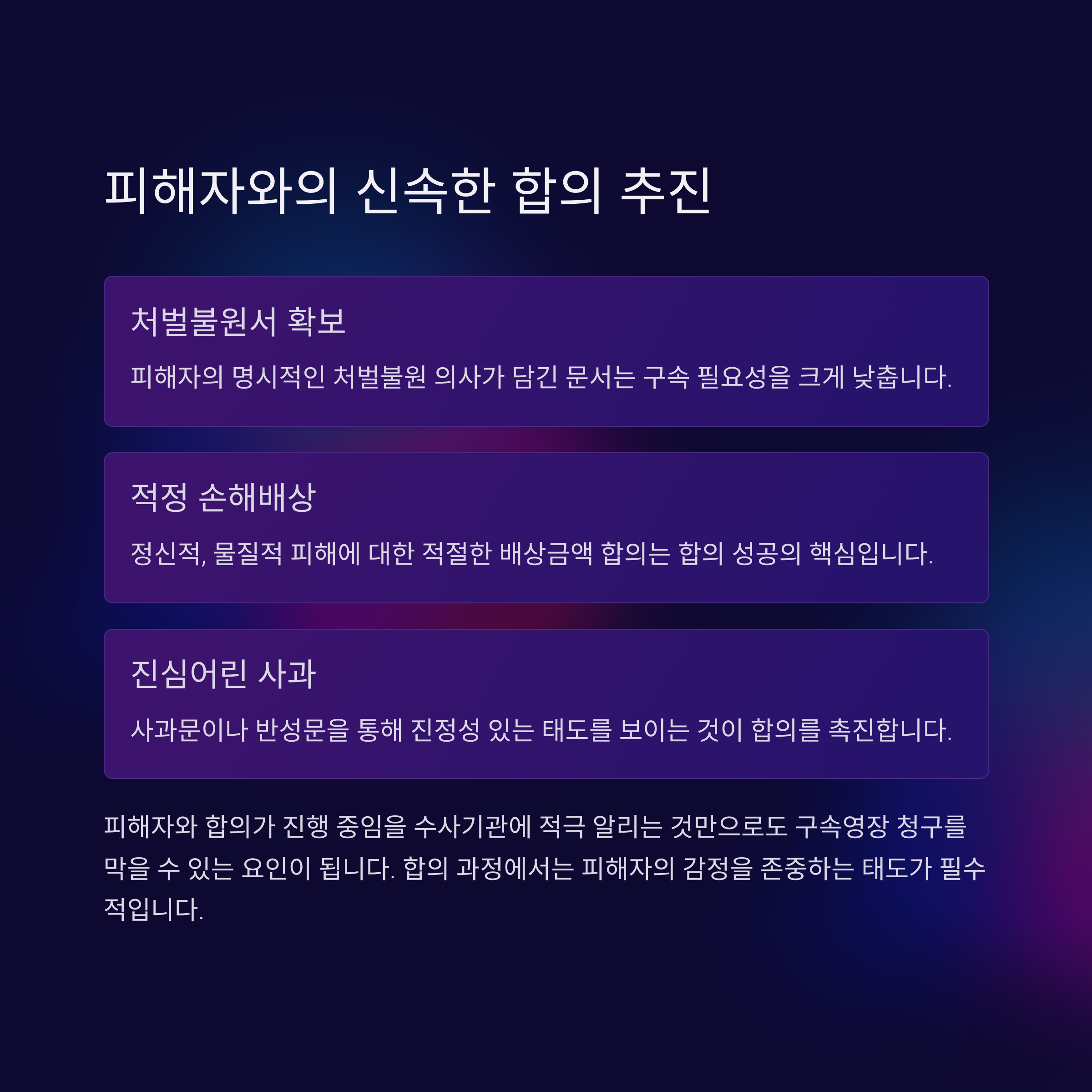 피해자와의 합의는 형사 절차 전반에서 가장 큰 감형 요인 중 하나입니다. 특히 처벌불원서를 제출하면 구속 필요성이 낮아질 수 있습니다.