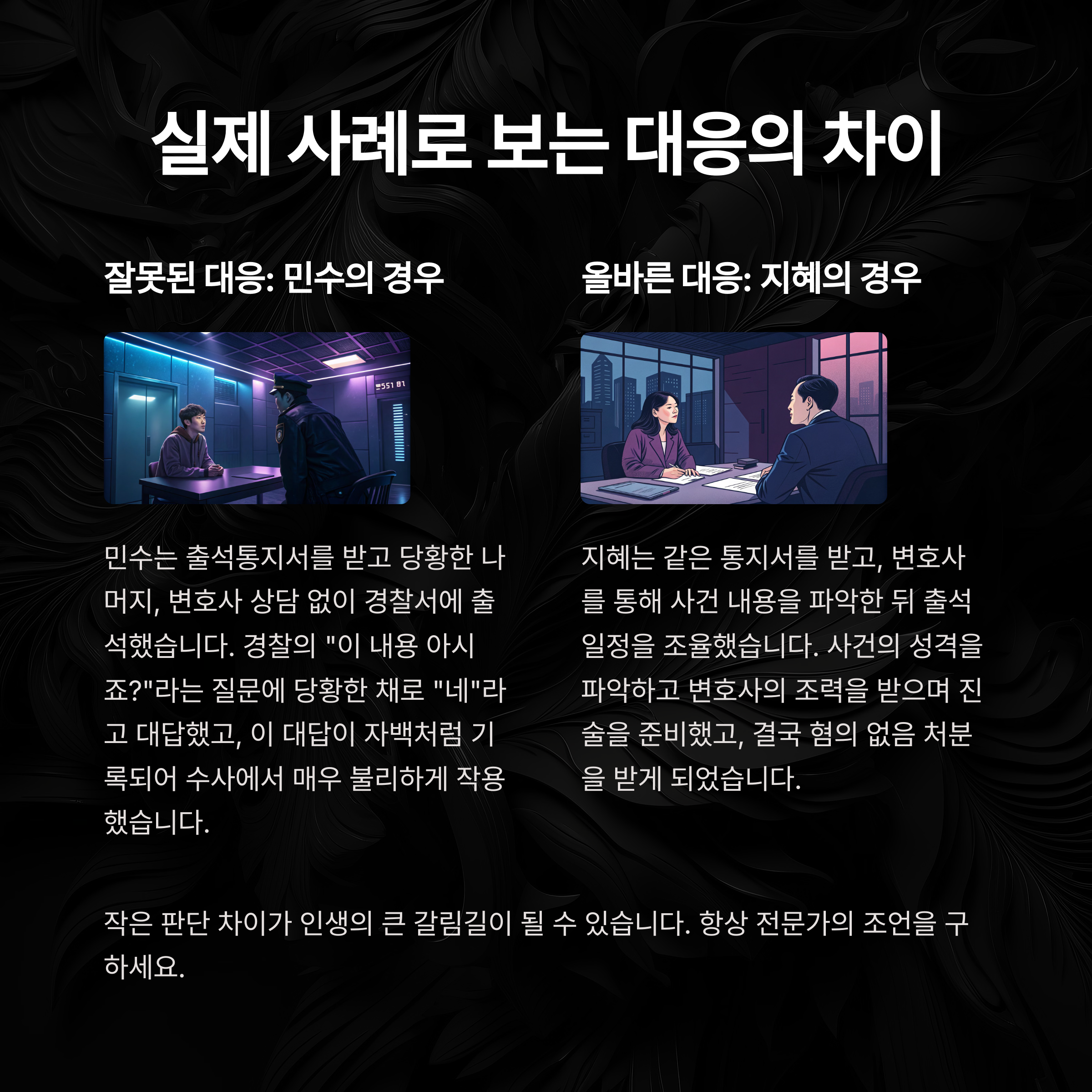 | 2단계 | 변호사 상담 및 대처 방향 설정 | 아무 준비 없이 경찰서 출석 |