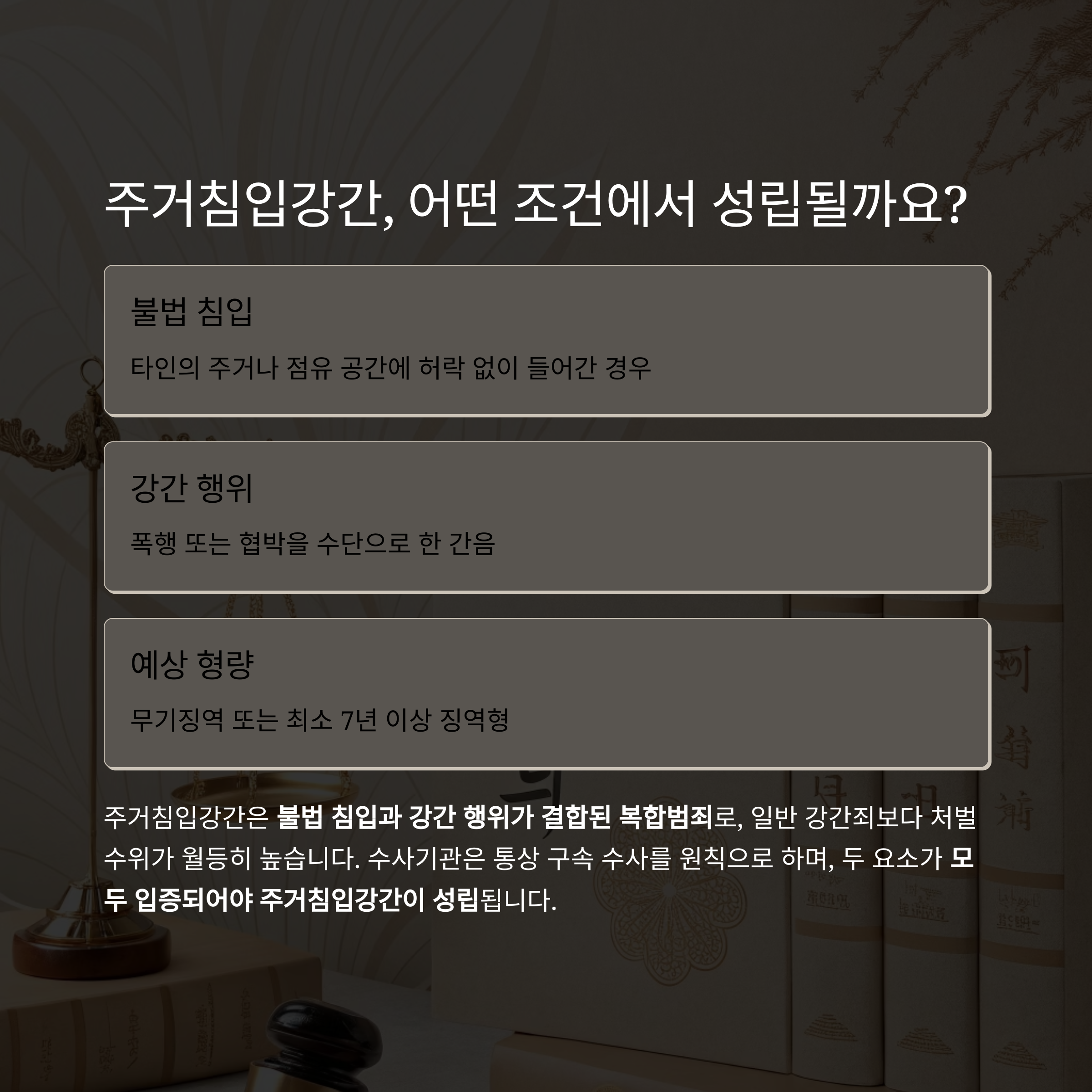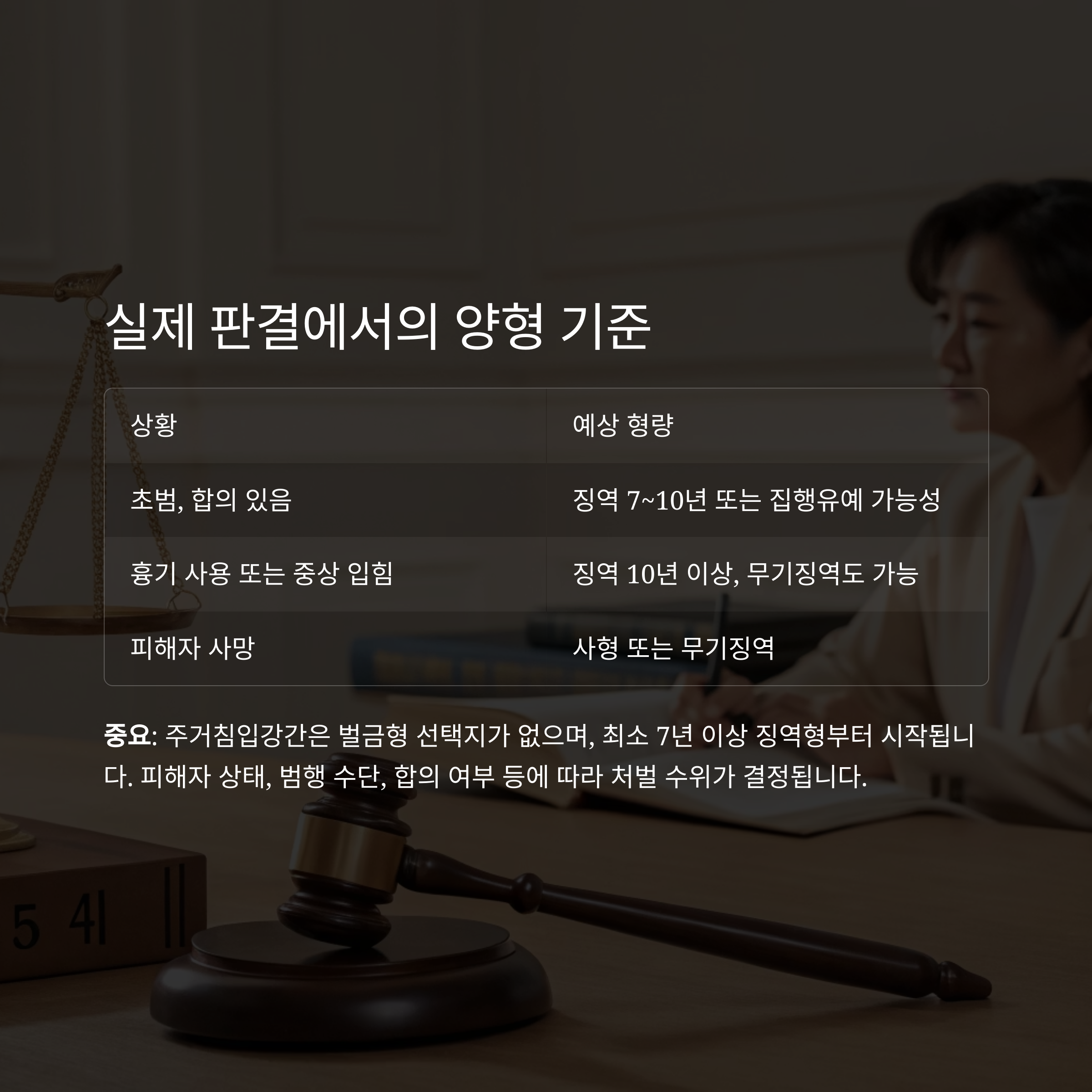 두 요소가 모두 입증되어야 주거침입강간이 성립하며, 혐의가 인정되면 무기징역 또는 최소 7년 이상 징역형에 처해질 수 있습니다.