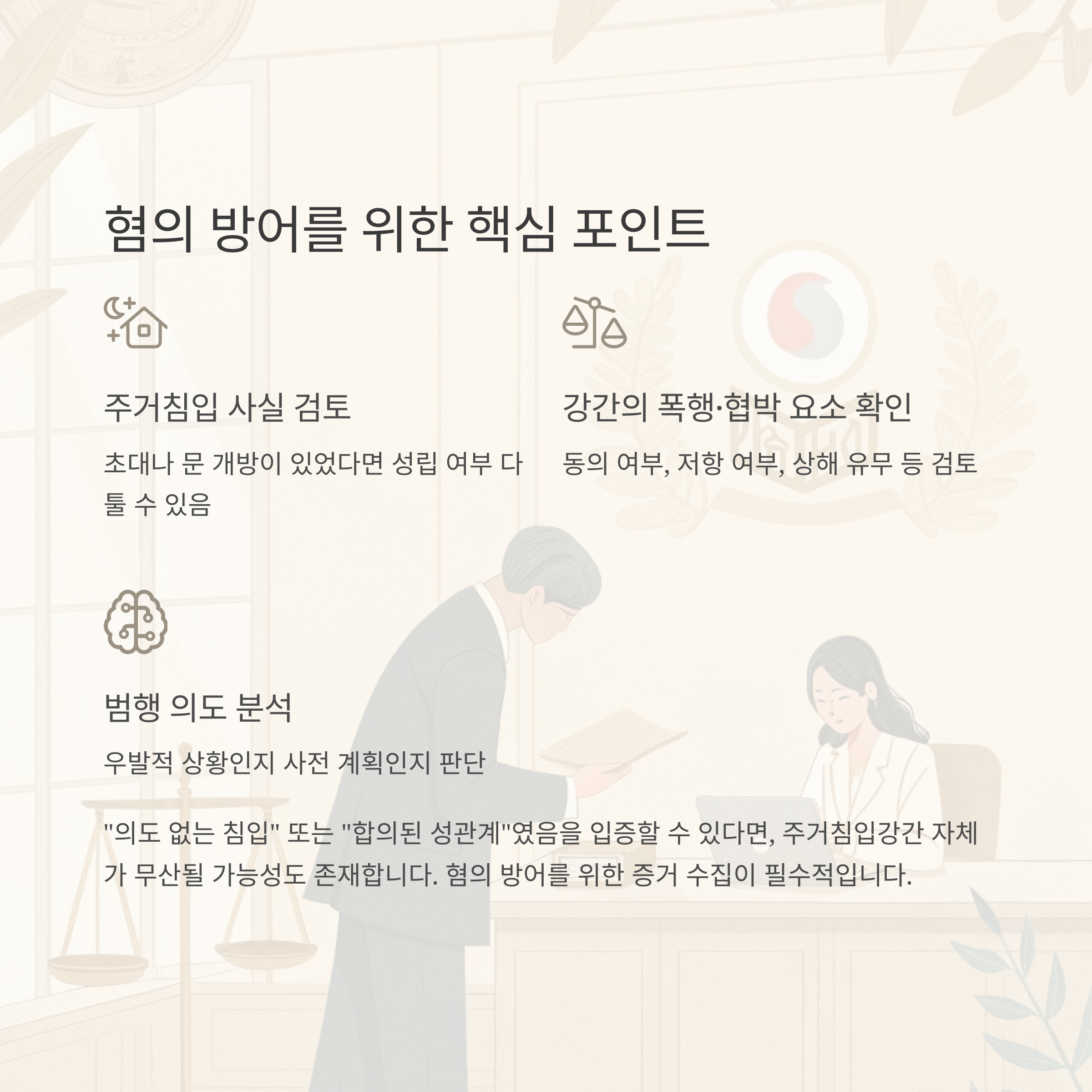 "의도 없는 침입" 또는 "합의된 성관계"였음을 입증할 수 있다면, 주거침입강간 자체가 무산될 가능성도 존재합니다.