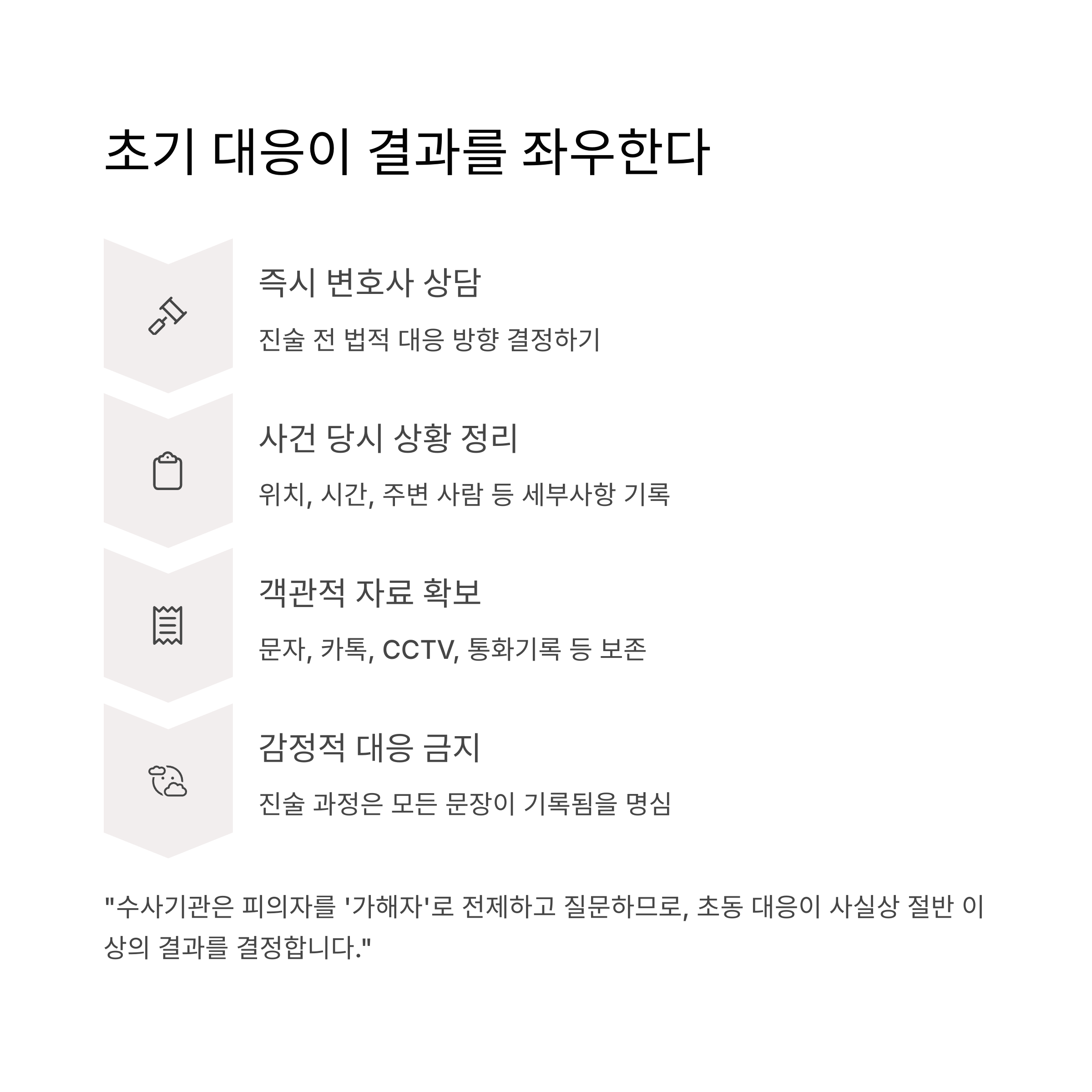 "수사기관은 피의자를 '가해자'로 전제하고 질문하므로, 초동 대응이 사실상 절반 이상의 결과를 결정합니다."