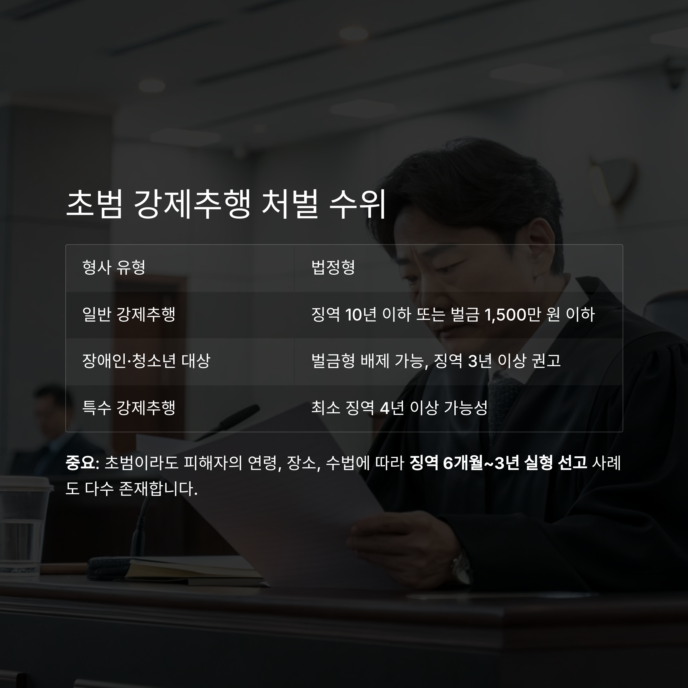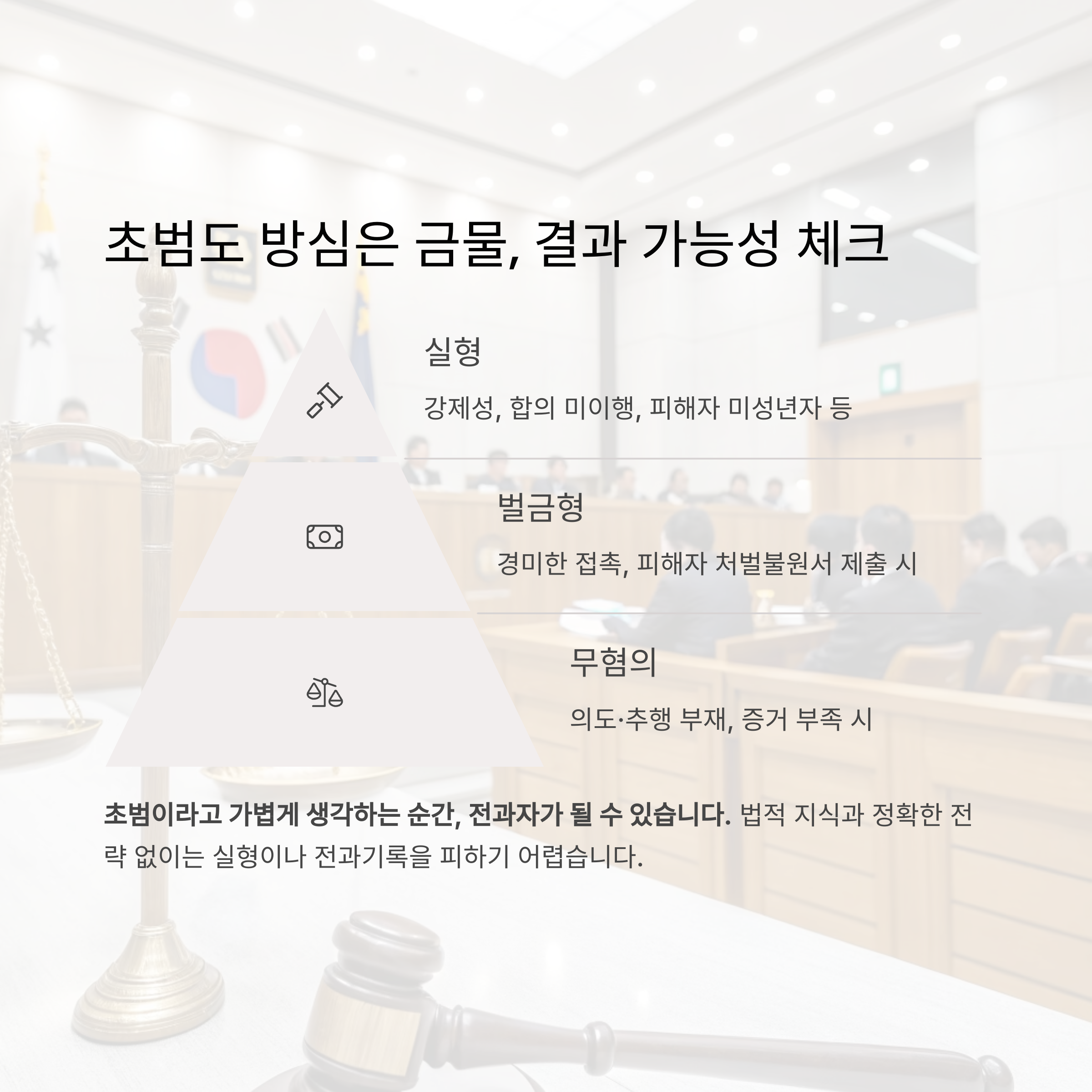 중요: 초범이라도 피해자의 연령, 장소, 수법에 따라 징역 6개월~3년 실형 선고 사례도 다수 존재합니다.