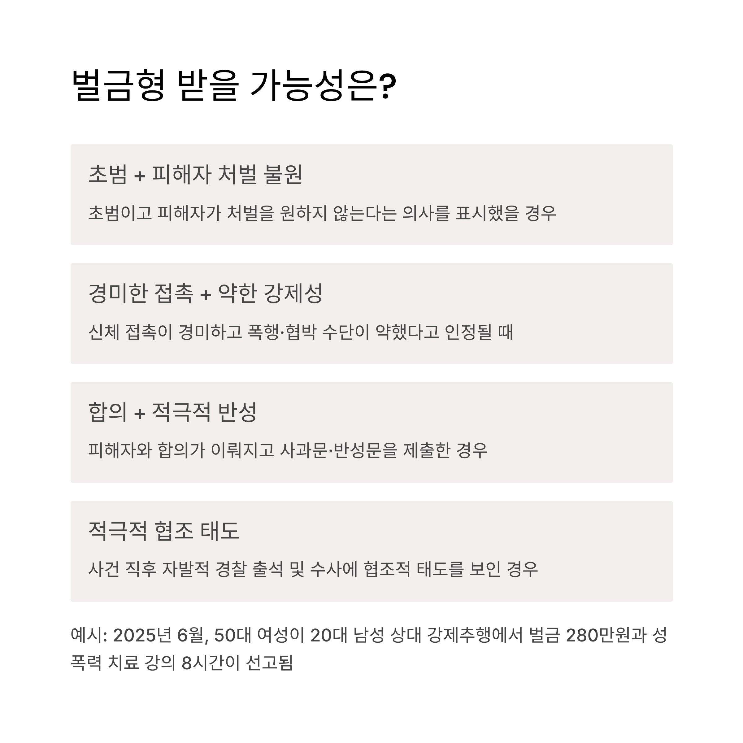 예시: 2025년 6월, 50대 여성이 20대 남성을 상대로 한 강제추행에서 벌금 280만 원과 성폭력 치료 강의 8시간이 선고됨