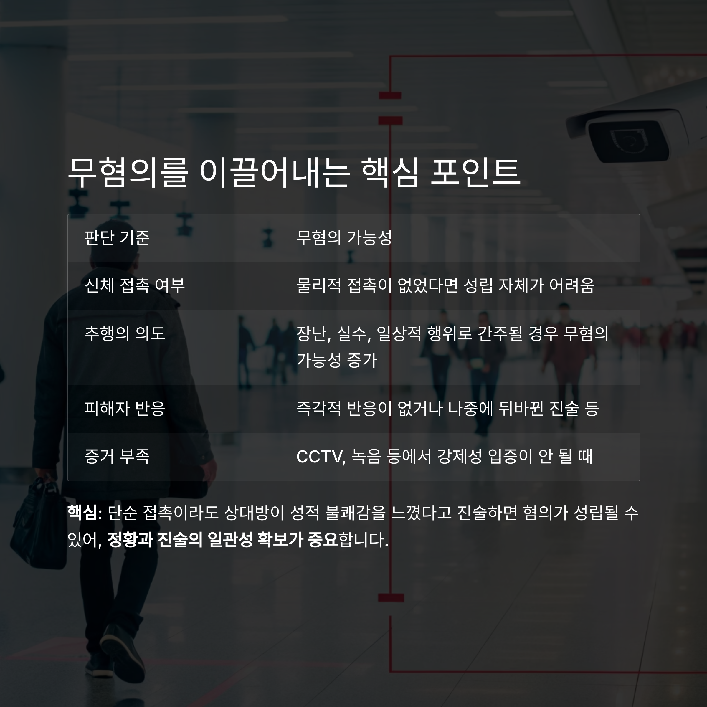 | 추행의 의도 | 장난, 실수, 일상적 행위로 간주될 경우 무혐의 가능성 ↑ |