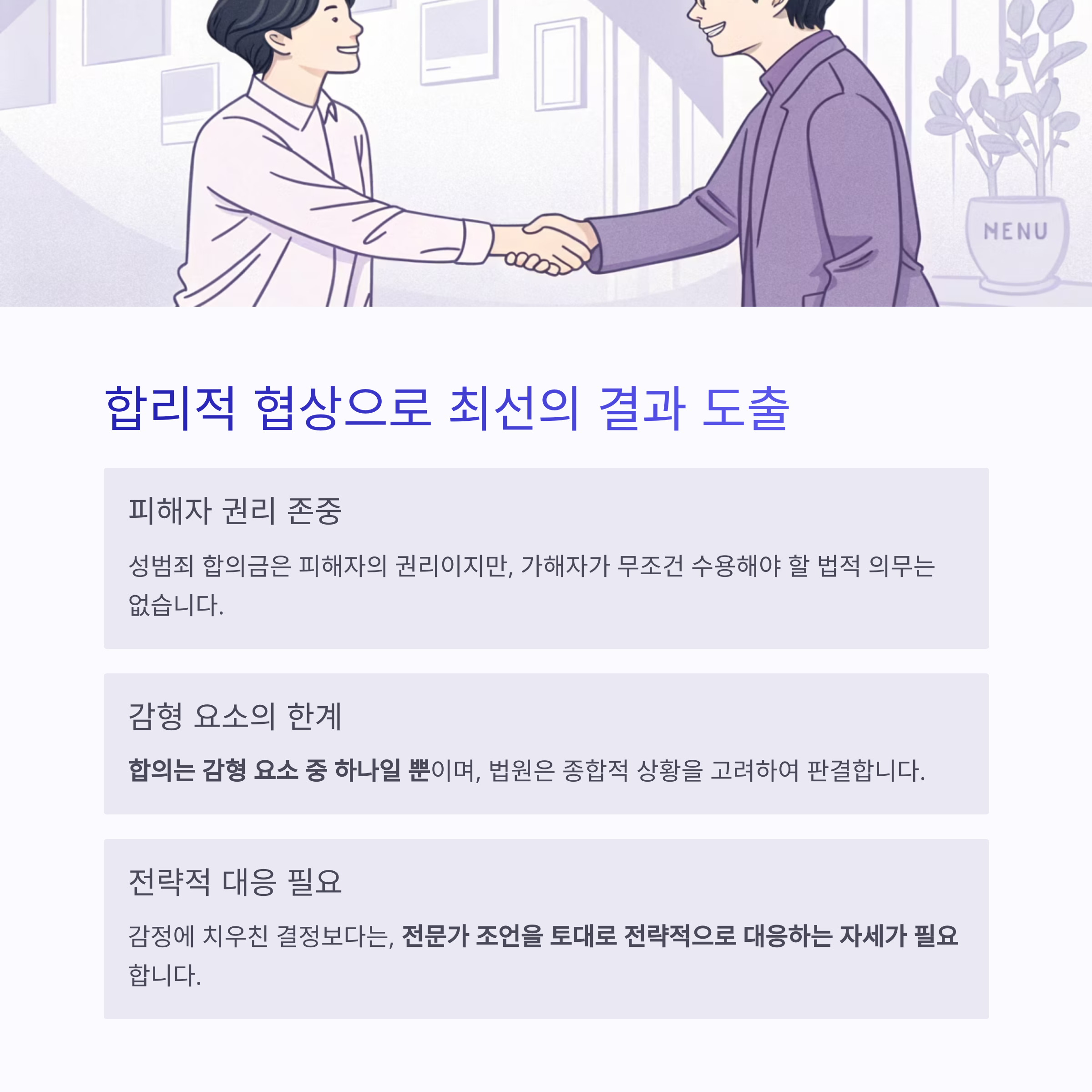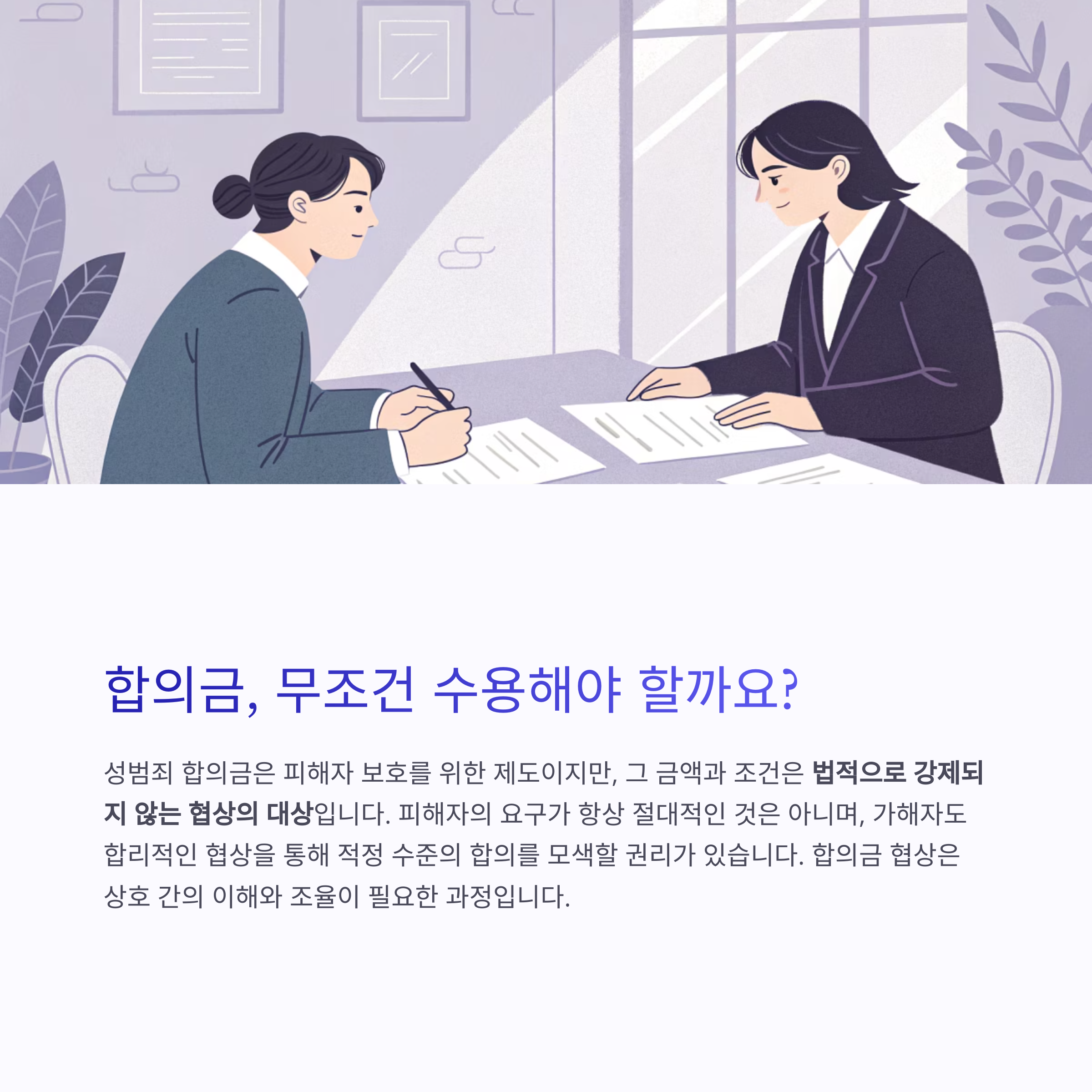성범죄 합의금은 피해 회복과 법적 절차의 일환이지만, 협상 과정에서 무조건적인 수용은 반드시 재고해야 합니다.