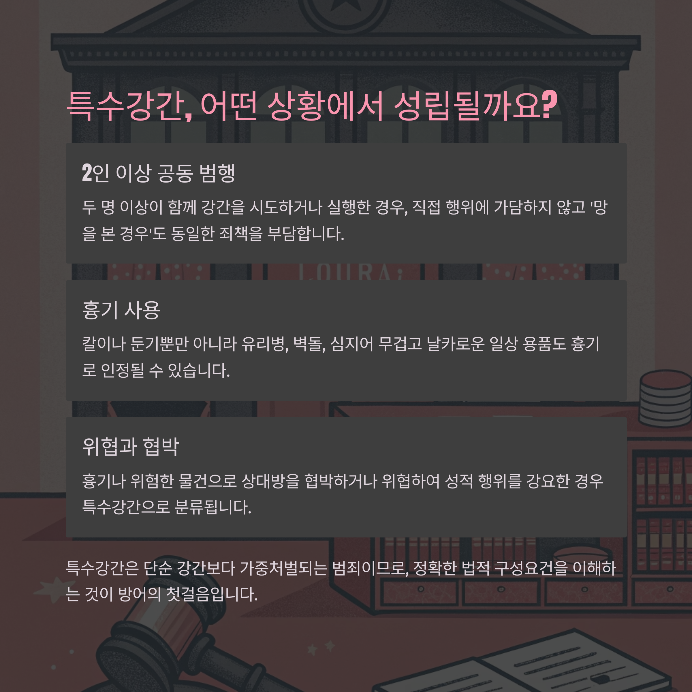 특수강간은 단순 강간보다 무겁게 처벌되는 성범죄입니다. 다음과 같은 요건이 충족될 경우 성립합니다.