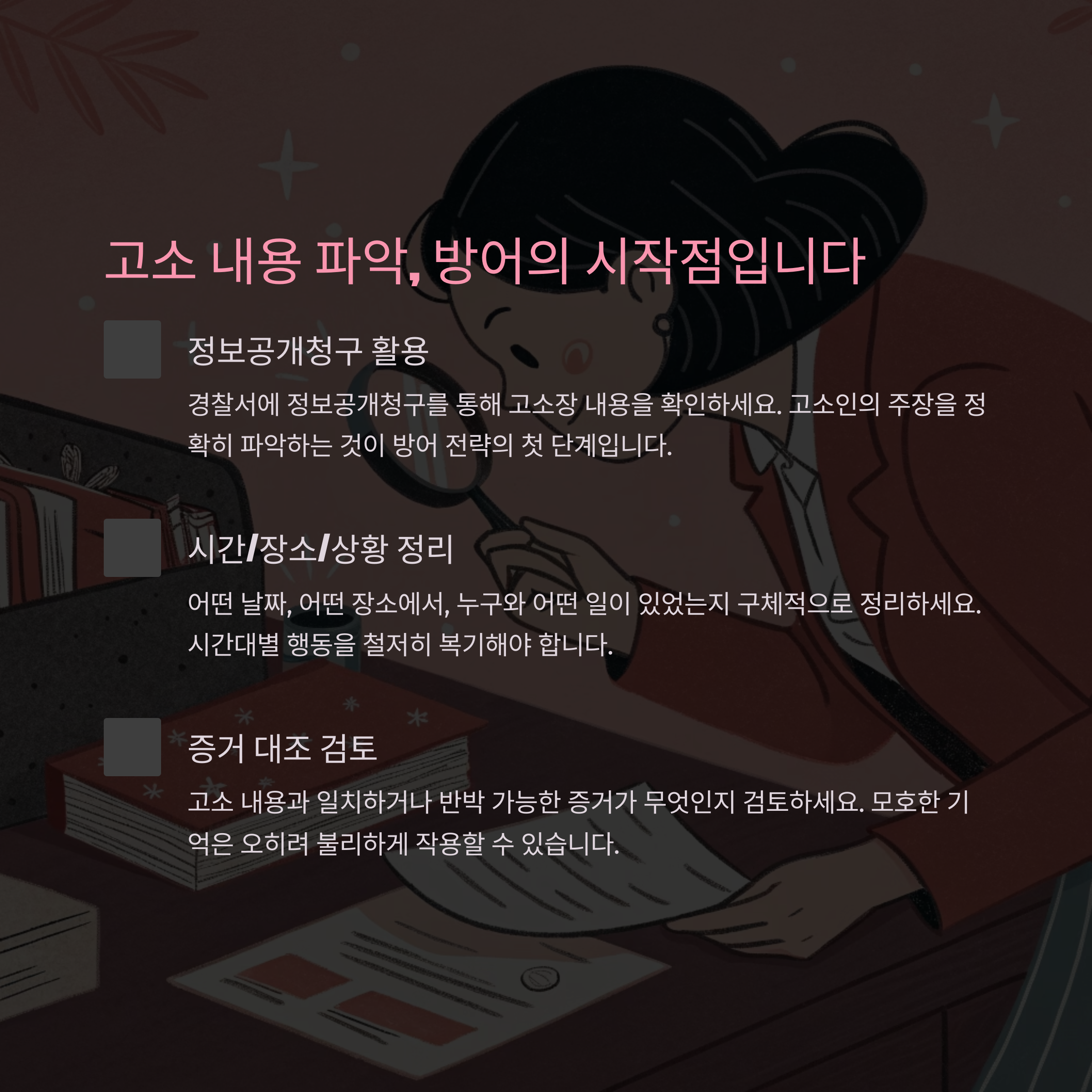 - 고소 내용과 일치하거나 반박 가능한 증거가 무엇인지 검토