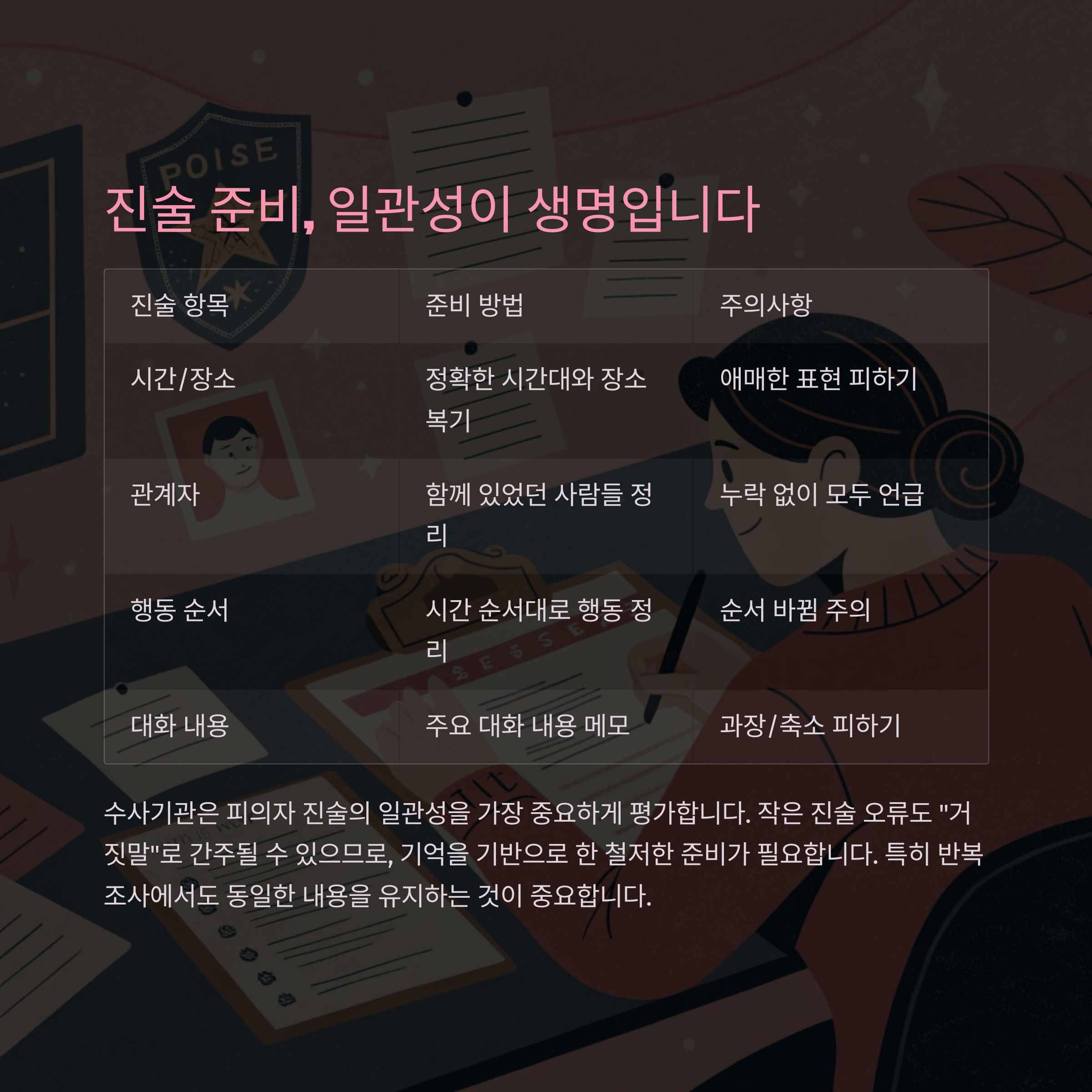 | 진술 일관성 유지 | 반복 조사에도 내용이 달라지지 않도록 기억 기반 서술 필요 |