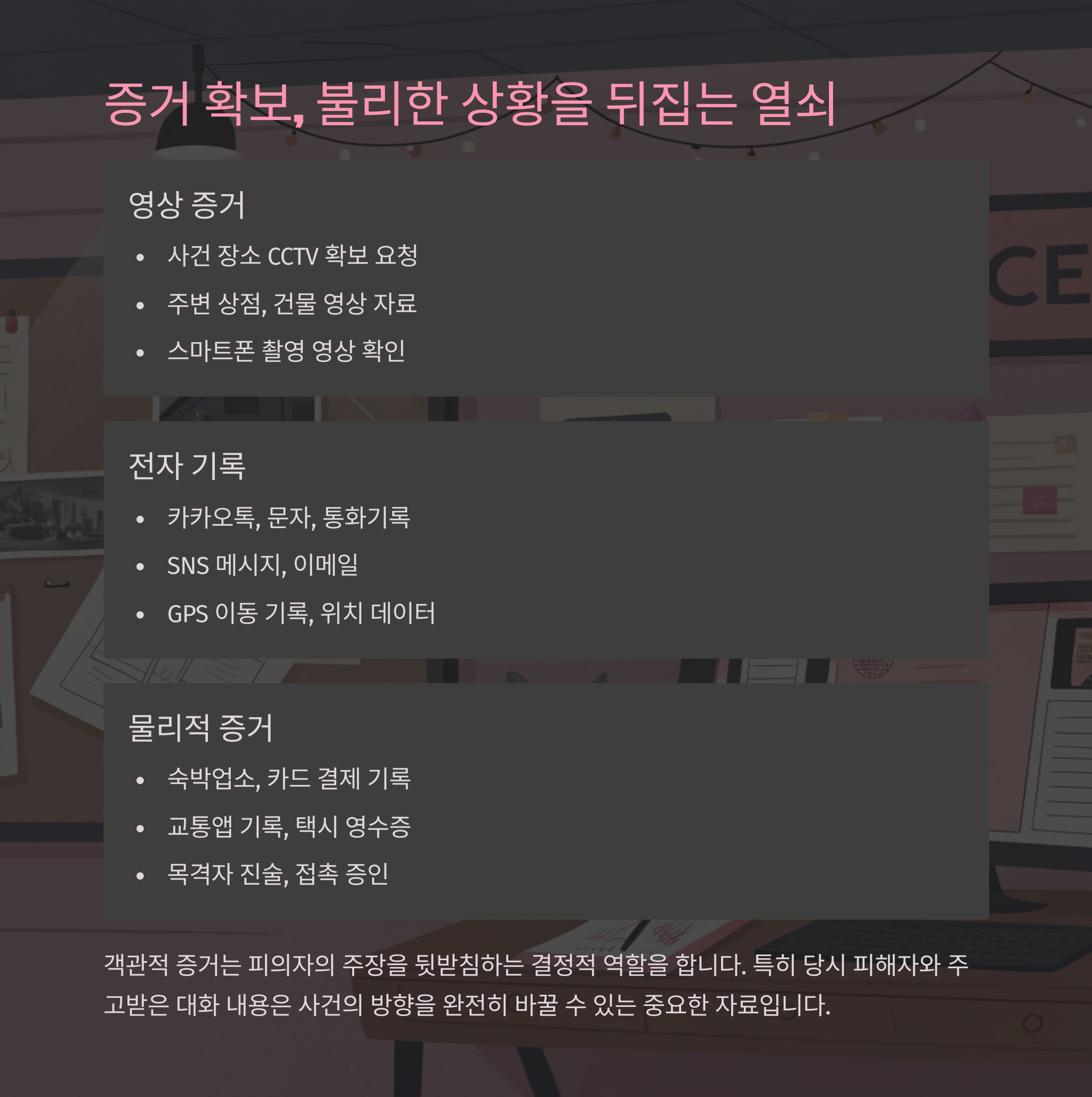 객관적 증거는 피의자의 주장을 뒷받침하거나 혐의를 반박하는 데 결정적인 역할을 합니다.