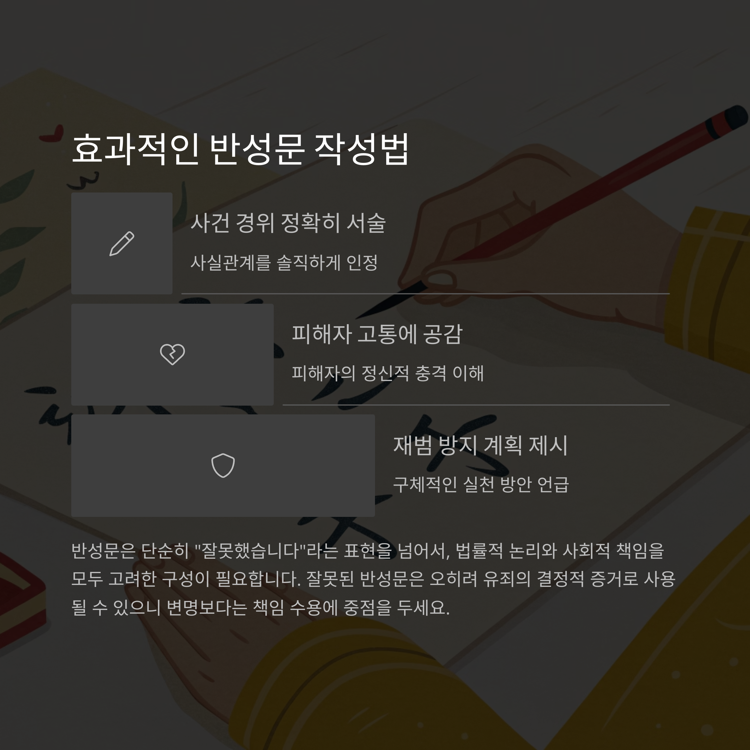 | 진정성 있는 사과 표현 | 자필 사과문, 직접 작성한 반성문 등 |