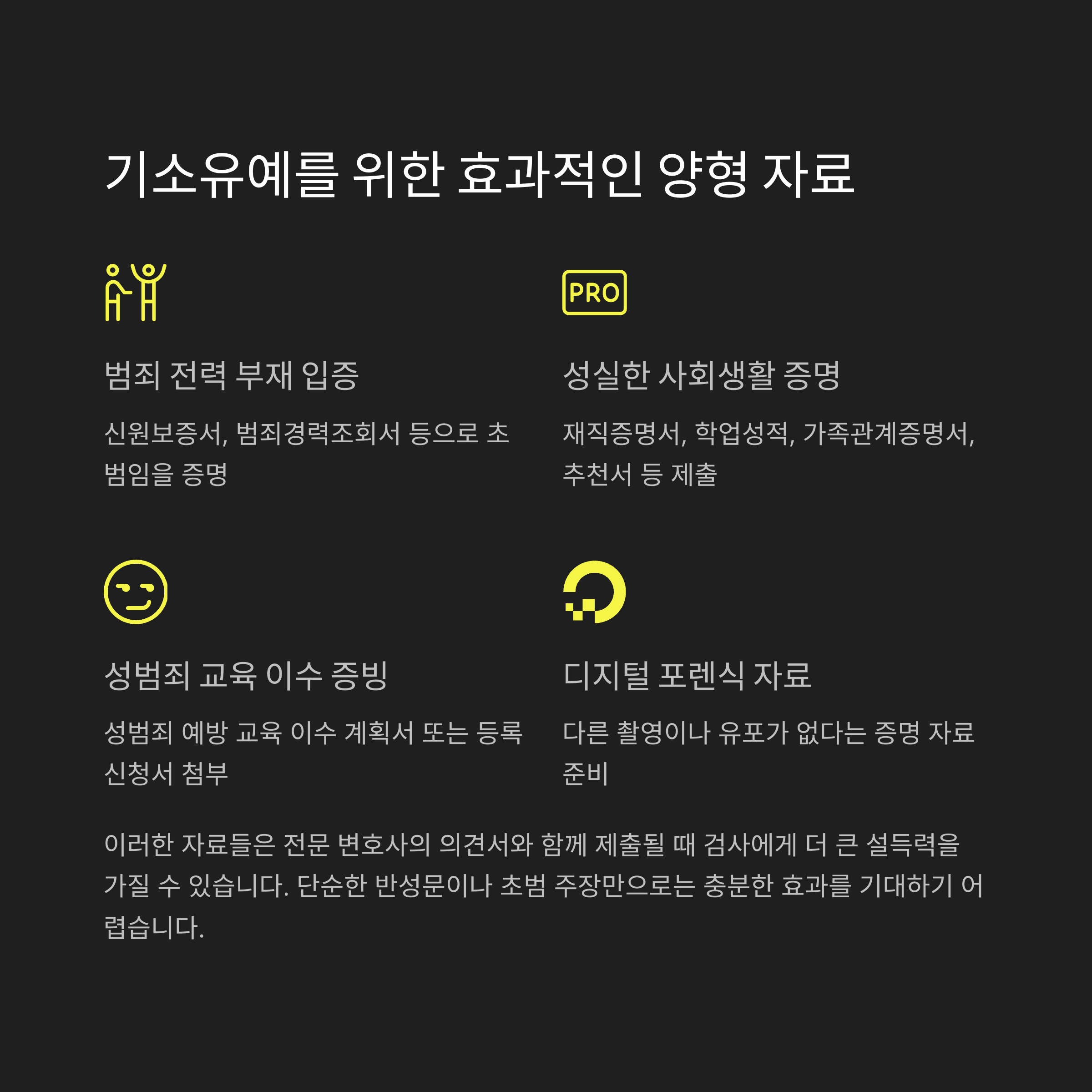 이러한 서류는 전문 변호사의 의견서와 함께 제출되면 훨씬 설득력을 높일 수 있습니다.