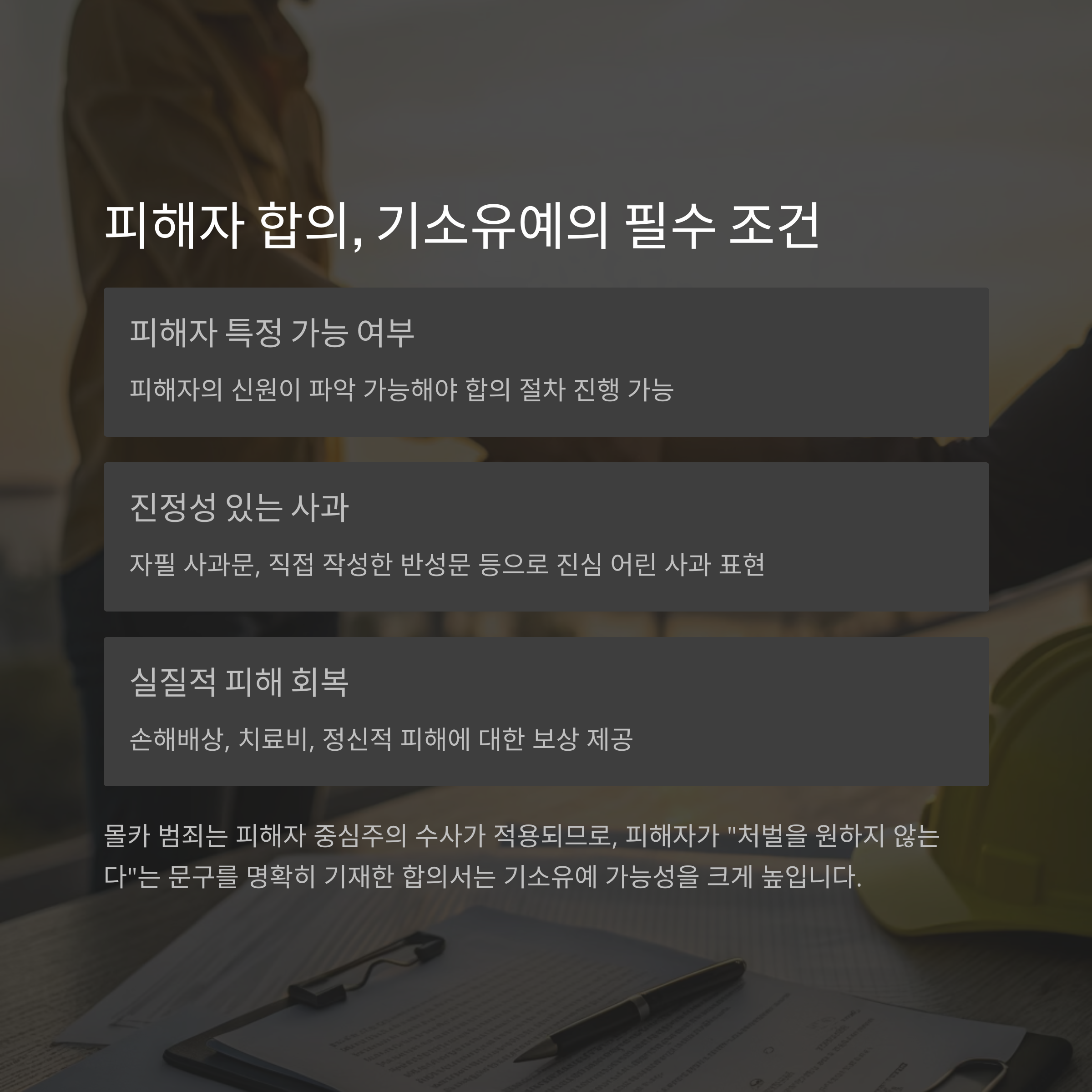 | 실질적 피해 회복 노력 | 손해배상, 치료비, 정신적 피해에 대한 보상 시도 포함 |