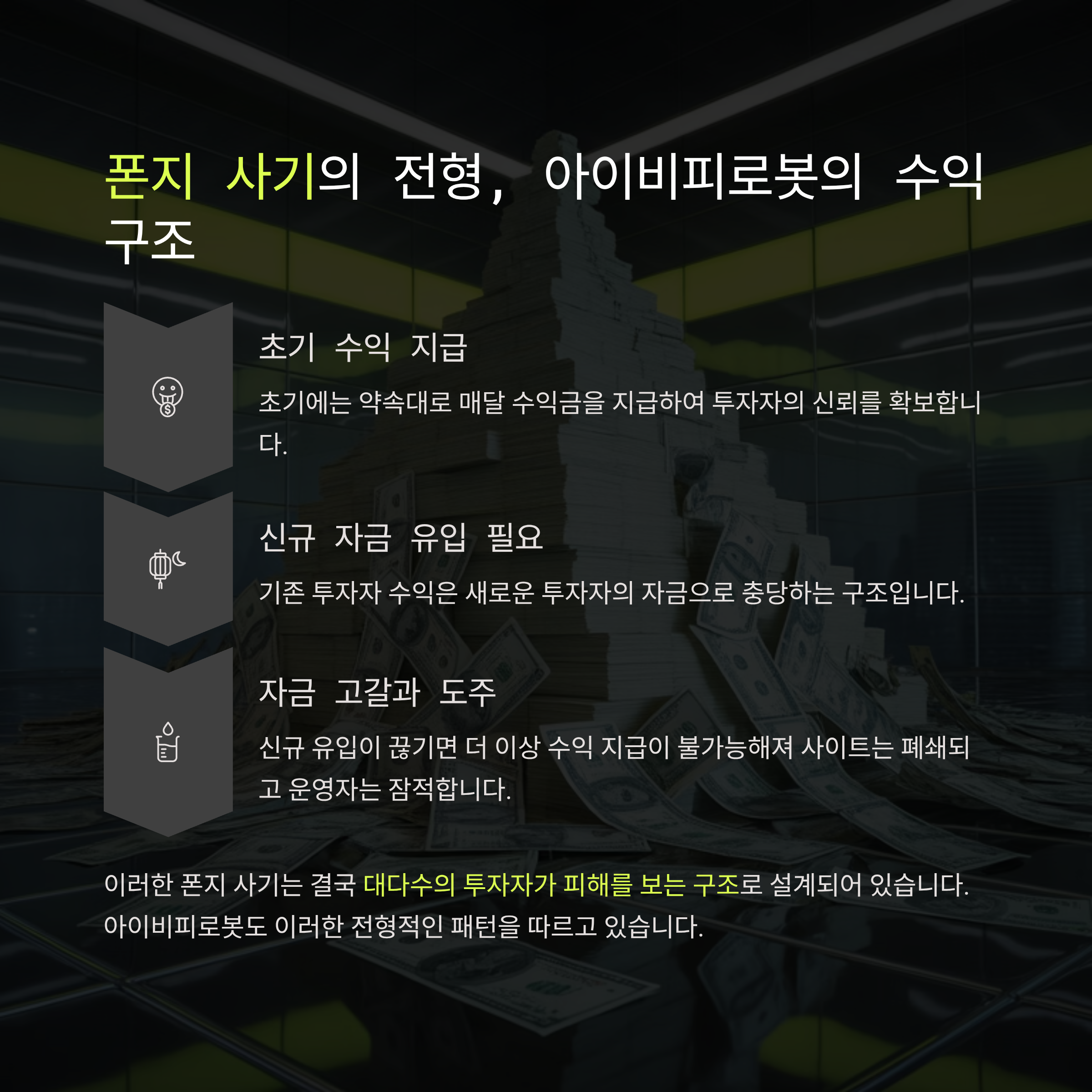 신규 투자자의 자금으로 기존 투자자의 수익을 지급하다가, 어느 순간 신규 유입이 끊기면 사이트는 사라지고 운영자도 잠적하는 시나리오. 이번 아이비피로봇 역시 그러한 흐름을 따르고 있는 듯합니다.