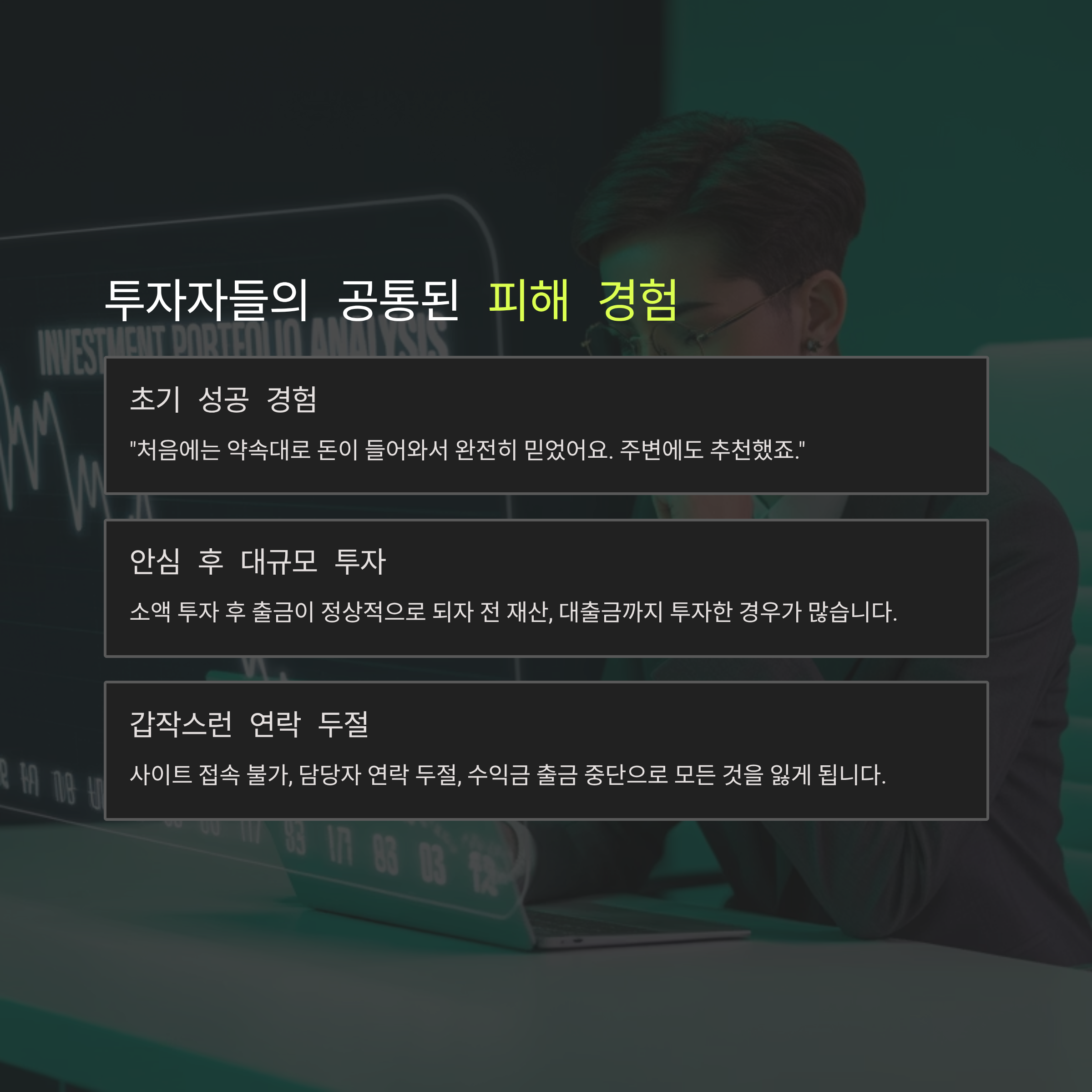 처음엔 소액을 투자해보고 출금이 정상적으로 되자 안심하고 큰 금액을 넣은 경우가 많습니다. 그 후 갑자기 사이트가 닫히고, 연락이 두절되며 전 재산을 잃은 사례도 적지 않습니다.
