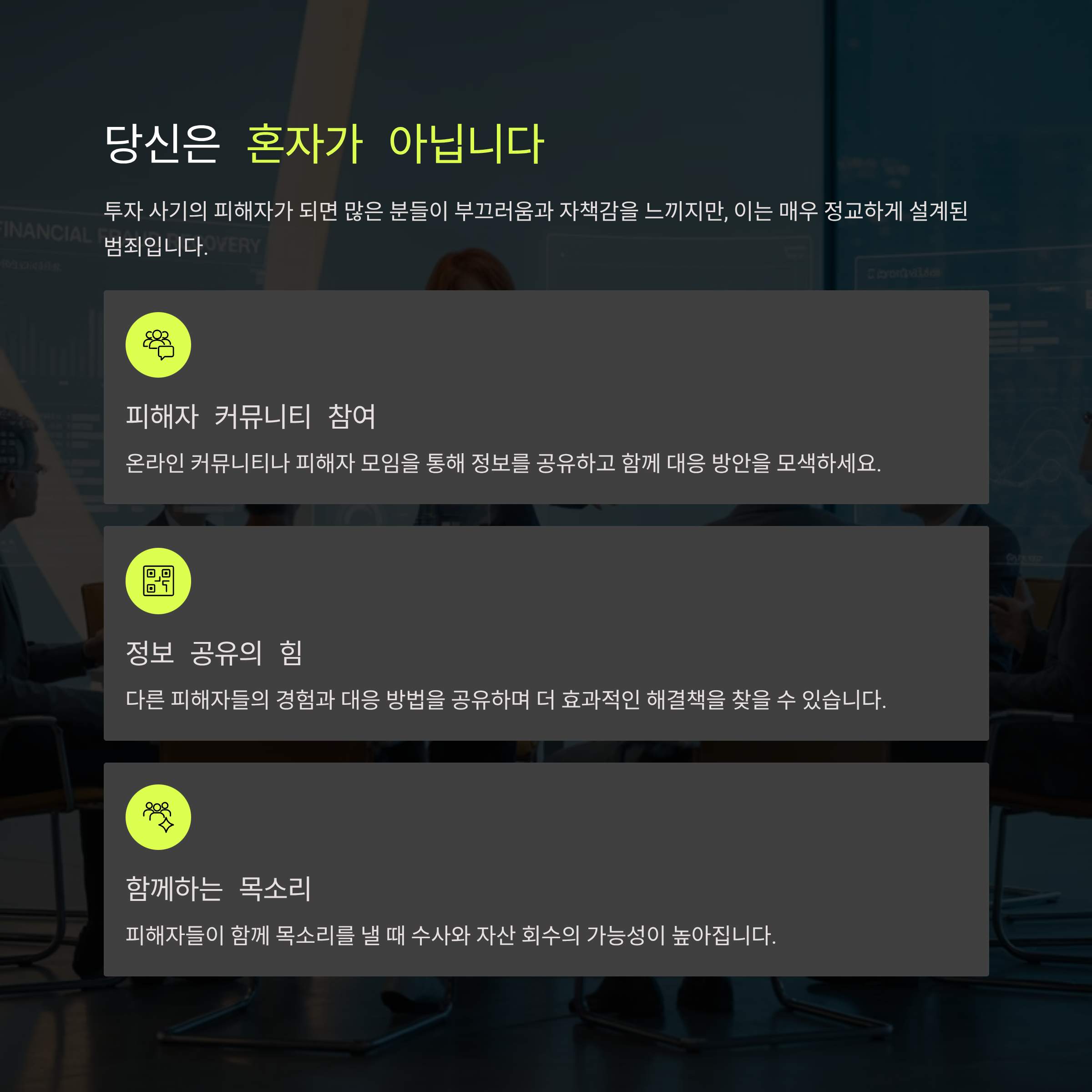 함께 대응할수록 피해 회복의 가능성은 높아집니다. 관련 커뮤니티, 피해자 모임 등을 통해 정보를 공유하고, 함께 법적 절차에 나서는 것이 필요합니다.