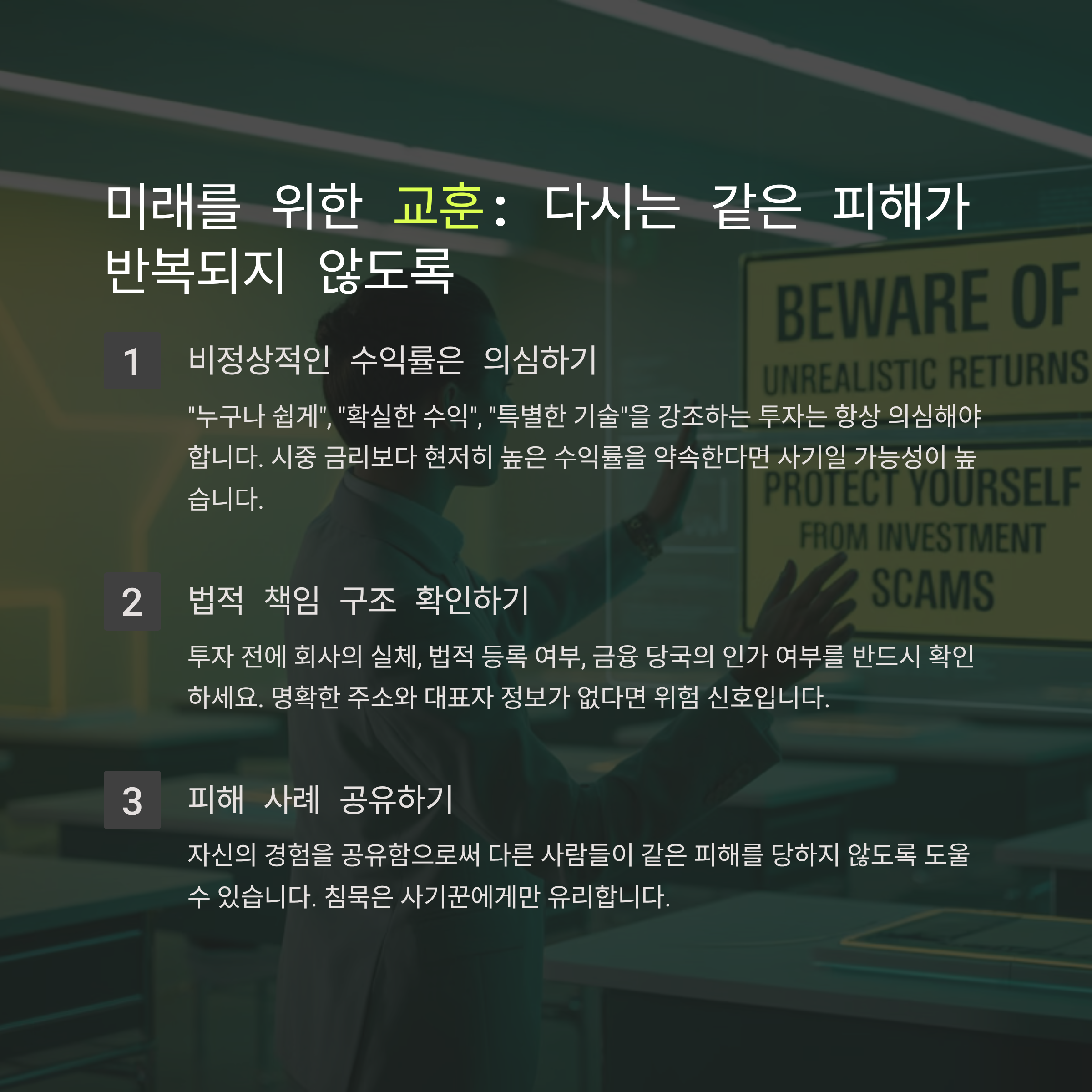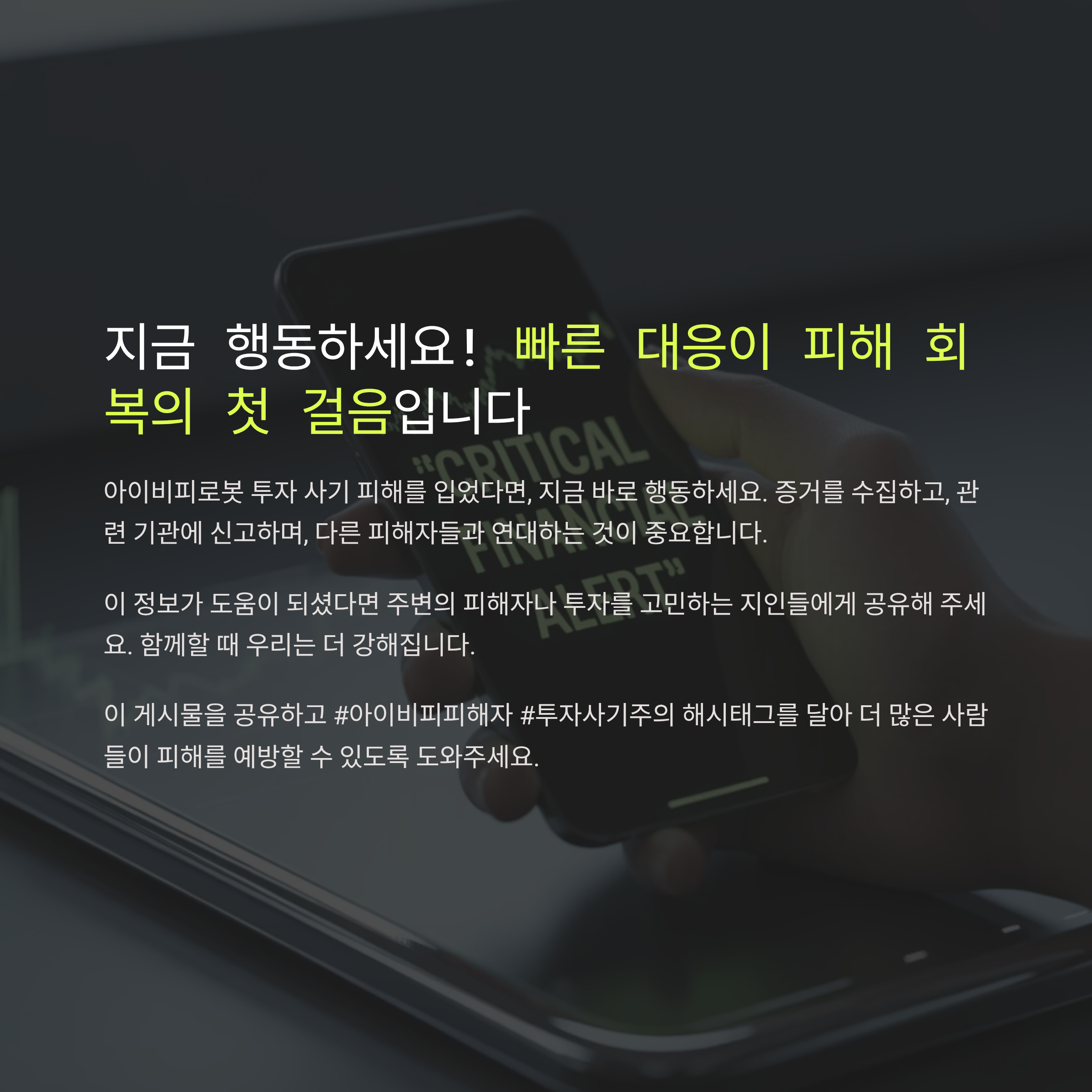 아이비피로봇 사태를 교훈 삼아, 앞으로는 어떤 투자든 그 배경과 수익 구조, 법적 책임 구조 등을 명확히 확인해야 합니다. 그리고 피해자 스스로가 목소리를 낼 때 또 다른 피해를 막을 수 있습니다.