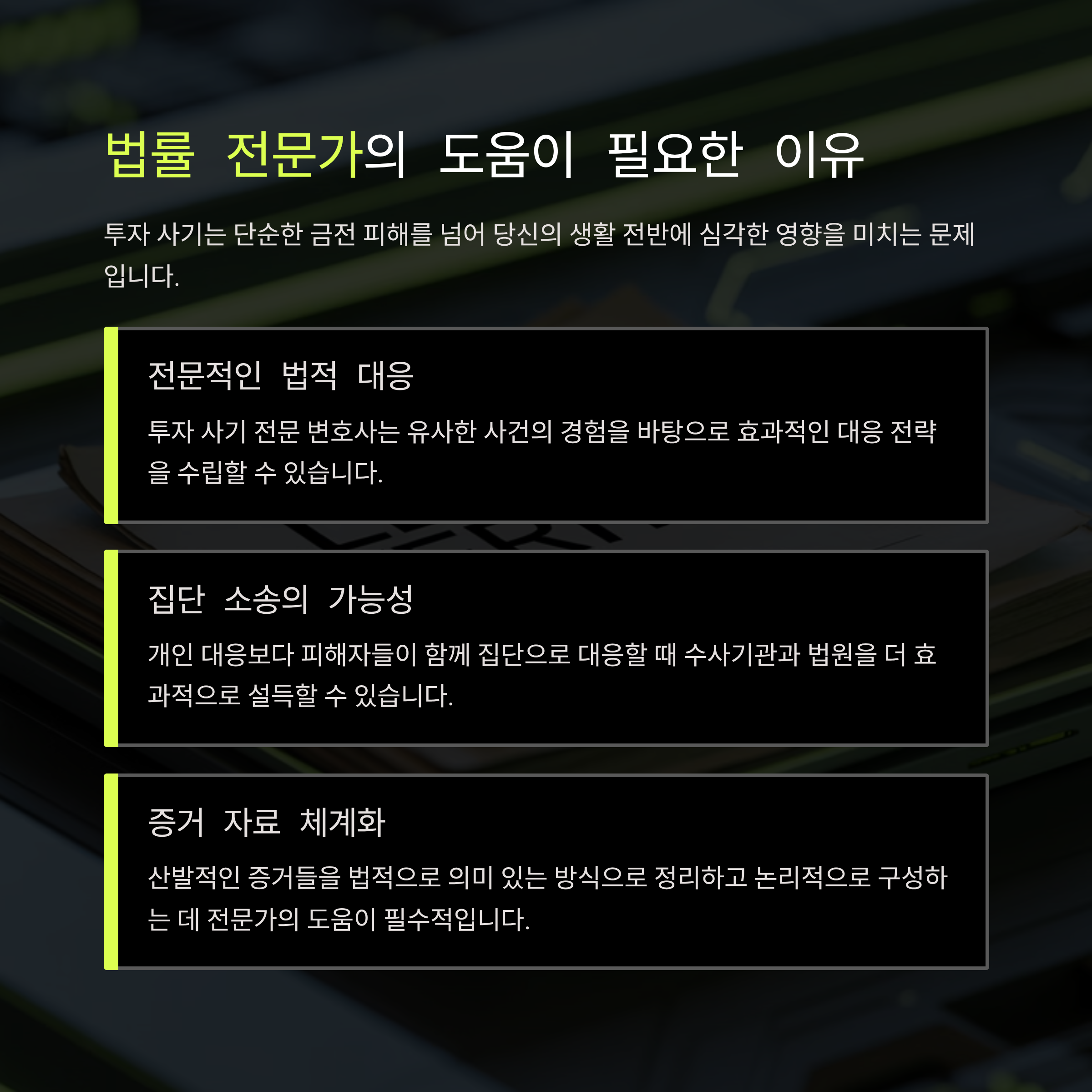 전문 변호사의 도움을 받으면, 개별 대응보다 더 효과적으로 형사 고소나 집단 소송을 준비할 수 있습니다. 또한, 수사기관과 법원을 설득할 수 있도록 자료 정리와 논리 구성에 큰 도움이 됩니다.