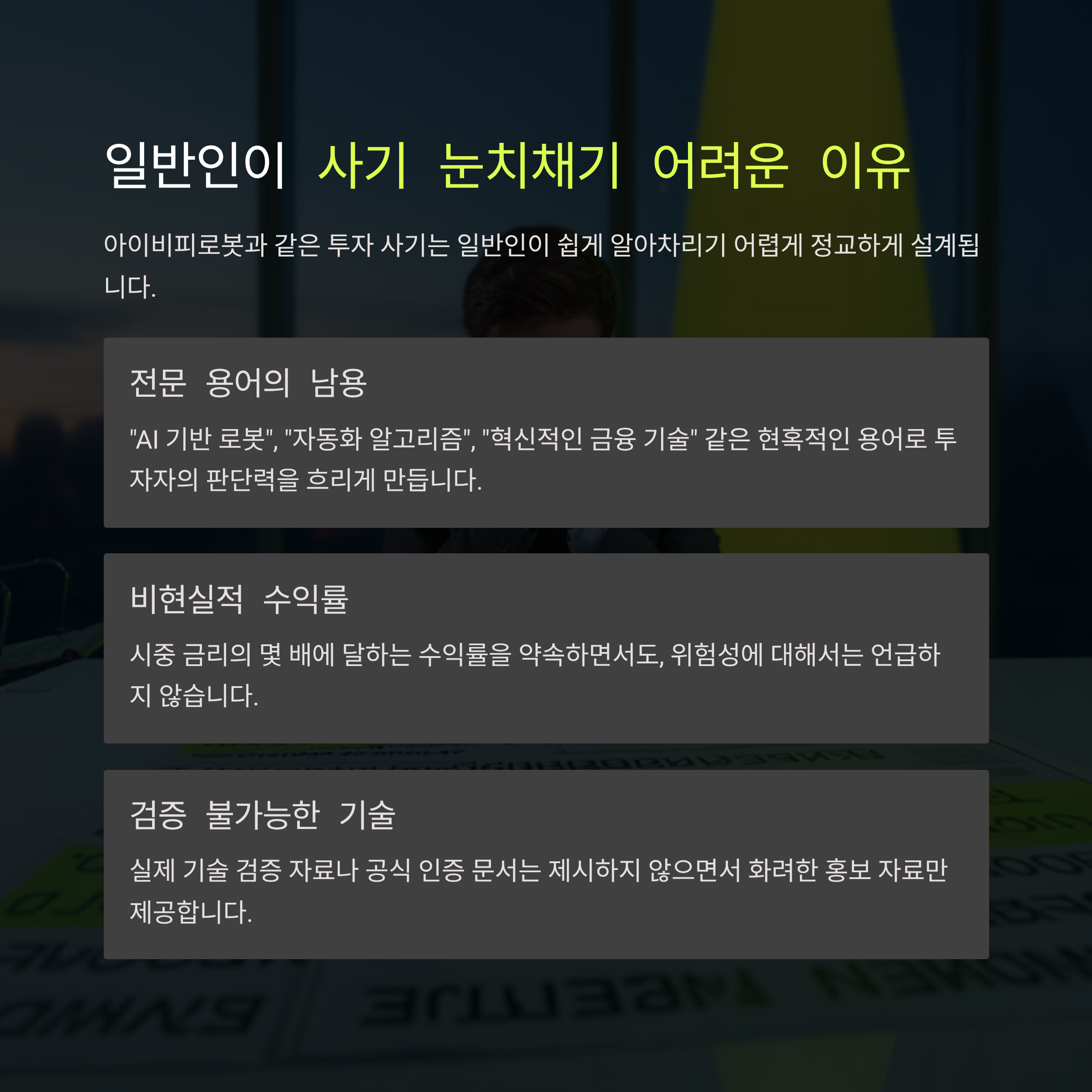 "AI 기반 로봇", "자동화 알고리즘", "혁신적인 금융 기술" 등은 매력적으로 들리지만, 실제 매출 자료나 기술 입증 문서는 제시되지 않는 경우가 대부분입니다.